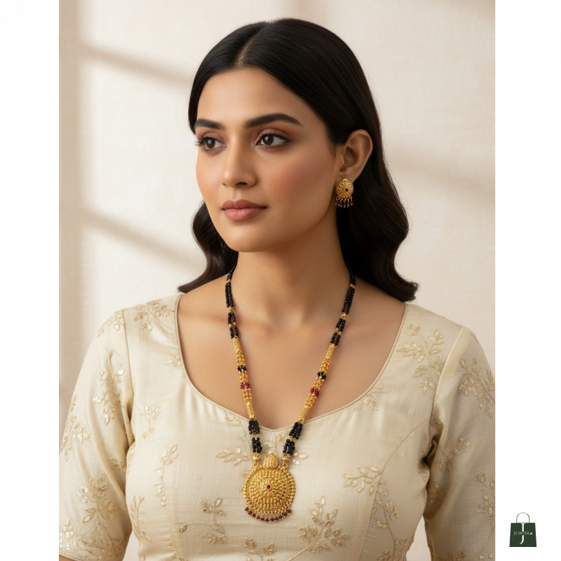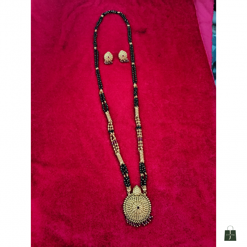 This mangalsutra features a traditional yet timeless design with a beautifully crafted gold pendant as its centerpiece. The pendant has a textured, intricate bead-work pattern and is accented with small red stones that add a subtle touch of color. The chain is made of alternating black beads and gold elements, symbolizing protection and marital harmony. The combination of black beads, gold detailing, and red accents gives the piece a rich, classic Maharashtrian-inspired look. It is paired with matching gold earrings, completing an elegant and graceful ensemble.