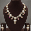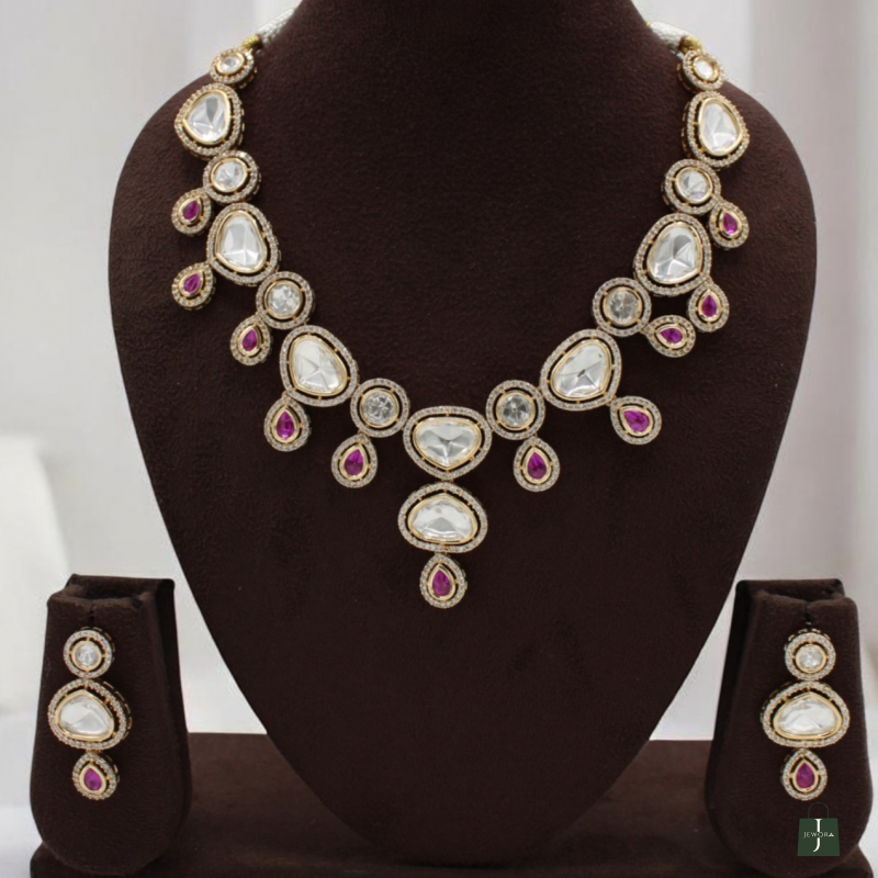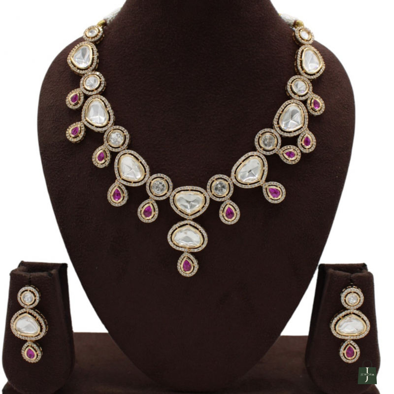 Make a royal style statement with this beautifully designed Kundan Necklace Set, crafted with elegant pear-shaped white stones and highlighted with rich magenta drop accents. The layered teardrop pattern creates a graceful cascading effect, while the vibrant magenta stones add a bold and festive touch.