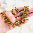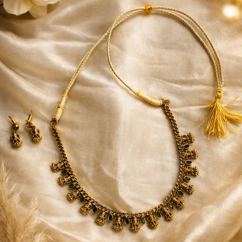 A timeless piece inspired by traditional temple jewellery, beautifully adorned with graceful Mahalakshmi motifs and elegant green stones that symbolize prosperity and harmony. Crafted with intricate detailing, this design brings together divine charm and rich heritage in a refined, elegant form.
