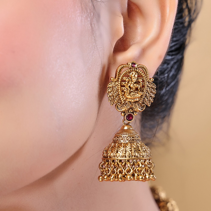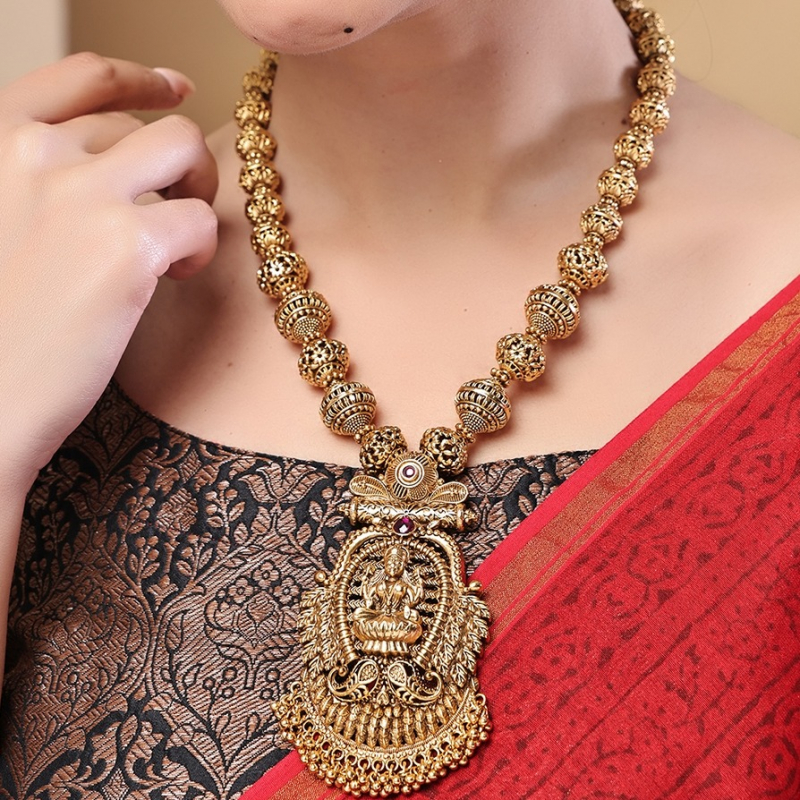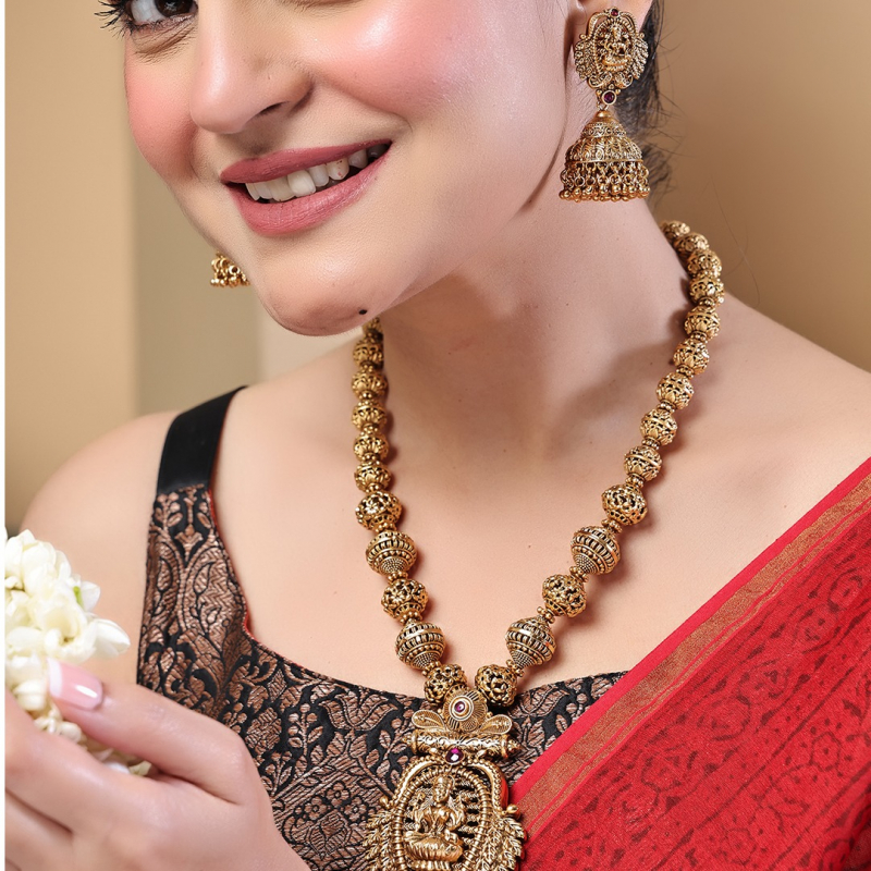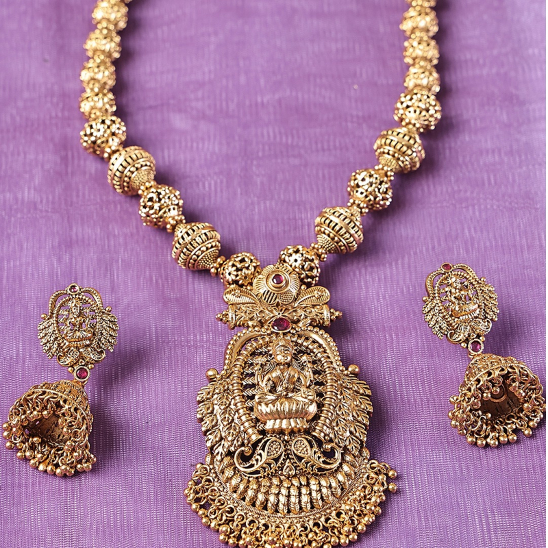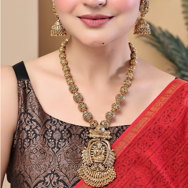 Embrace divine elegance with this stunning Mahalaxmi necklace set, featuring Goddess Laxmi gracefully seated on a lotus at the center. Crafted with rich gold polish, the design reflects traditional temple artistry and spiritual charm. The necklace is beautifully adorned with gold-toned pearls that enhance its royal and luxurious appeal. Intricate detailing and fine craftsmanship make this set perfect for weddings, festive occasions, and cultural celebrations. Paired with matching earrings, it adds a graceful and auspicious touch to your look. This timeless piece symbolizes prosperity, beauty, and blessings, making it a perfect addition to your ethnic jewelry collection.