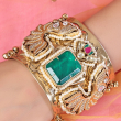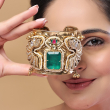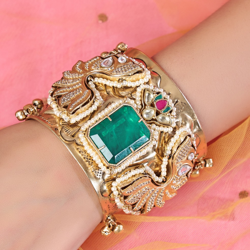 Step into royal elegance with this exquisite Maharani Emerald Pearl Heritage Kada, a masterpiece inspired by timeless Mughal artistry. The centerpiece features a rich emerald green stone, beautifully encased with delicate pearl detailing that adds a touch of grace and sophistication. Intricate kundan work, along with subtle ruby accents and finely studded elements, enhances its luxurious appeal. The broad gold-toned band with artistic motifs gives it a bold and majestic presence. Perfect for bridal wear, weddings, and festive occasions, this kada is designed to make you stand out with unmatched regal charm and elegance.