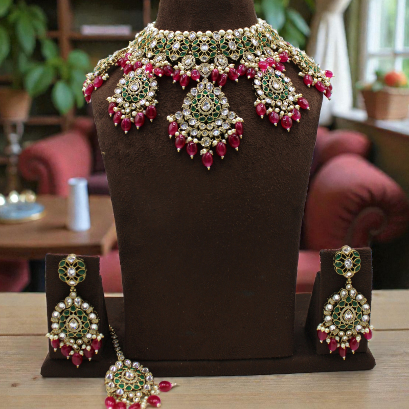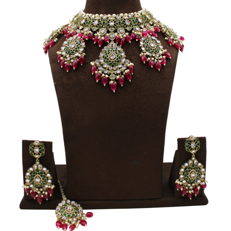 The grand center pendant and side motifs enhance the royal appeal, while delicate pearl highlights add elegance and balance to the bold color combination. This set comes with matching statement earrings and a coordinating maang tikka, making it a complete bridal ensemble perfect for weddings and grand festive occasions.