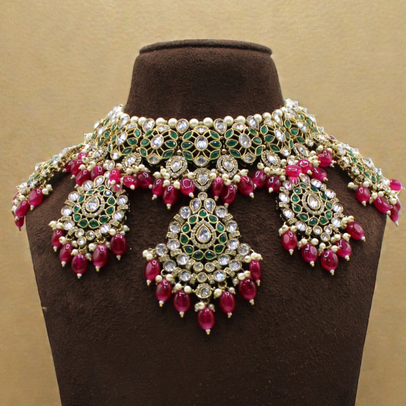Make a majestic statement with this luxurious bridal choker set, crafted with intricate Kundan artistry and vibrant gemstone detailing. The necklace features a rich arrangement of emerald green stones paired with sparkling clear Kundan crystals, beautifully accented with deep ruby-red bead drops for a regal finish.