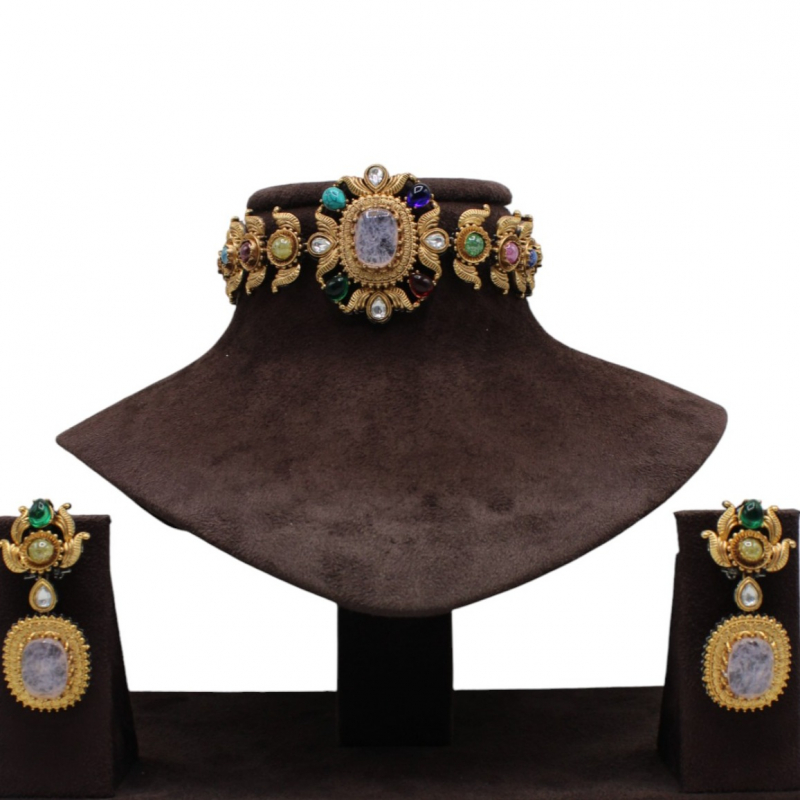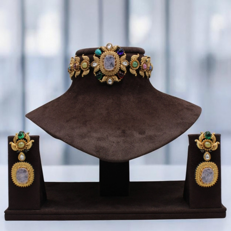 The structured choker band is adorned with symmetrical handcrafted motifs, each embellished with colorful cabochon stones and delicate crystal accents. The matching drop earrings beautifully complement the choker, showcasing oval center stones with detailed antique gold borders and elegant top motifs.