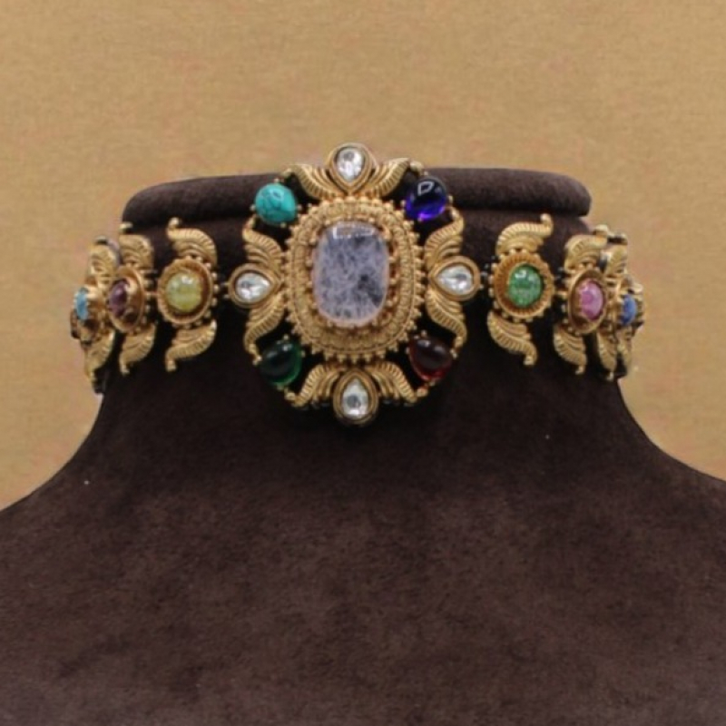 Embrace royal elegance with the Maharani Heritage Navratna Choker Set, a masterpiece inspired by traditional temple jewellery artistry. This exquisite choker features a bold central oval stone framed with intricate sunburst-style detailing and surrounded by vibrant multicolor Navratna-inspired stones.