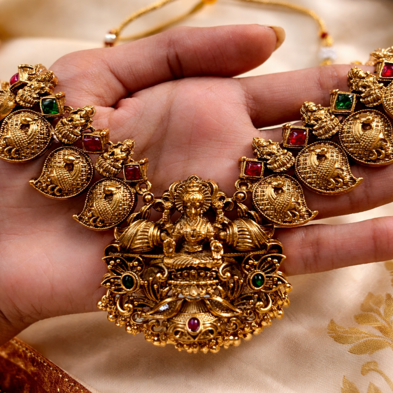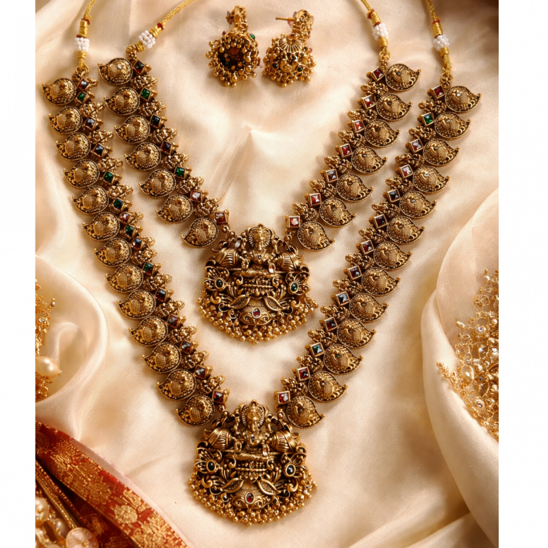 Elevate your bridal look with this exquisite Maharani bridal jewellery set, crafted in a rich antique finish that reflects timeless royal elegance. This grand set includes a beautifully detailed necklace paired with a long haram, creating a layered and regal appearance perfect for weddings and festive occasions. Complementing the set is a pair of intricately designed matching jhumkas that complete the traditional ensemble.