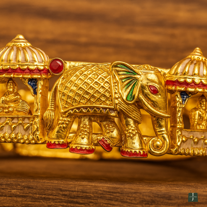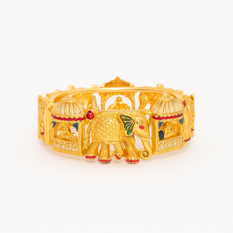 The Majestic Elephant Howdah Temple Kada Bangle is a regal piece of traditional craftsmanship. Showcasing intricately carved elephants adorned with enamel detailing and carrying ornate canopies (howdahs), this kada embodies grandeur and heritage. The gold polish finish highlights its temple jewellery design, while the multicolor stone accents add vibrancy. Crafted with a secure screw closure, this kada bangle is ideal for festive and cultural occasions, bringing royal artistry to your jewellery collection.
