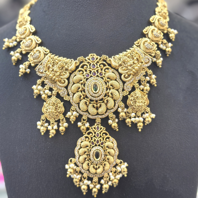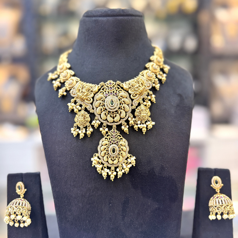 The cascading pearls, delicate engravings, and double-tiered pendant create a majestic aura perfect for weddings, festivals, and special occasions. The matching jhumka-style earrings, embellished with ruby and emerald stones, complete this regal set with timeless charm.