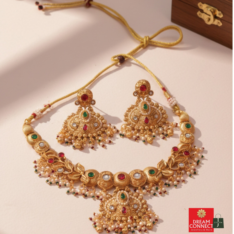 Embrace timeless elegance with the Golden Leaf Harmony Choker, a masterpiece featuring intricate leaf-patterned goldwork. This antique-style set is anchored by a magnificent floral-centered pendant adorned with vibrant ruby and emerald-colored stones. Finished with delicate pearl accents and matching scalloped earrings, this ensemble brings a regal, nature-inspired touch to your most cherished celebrations.
