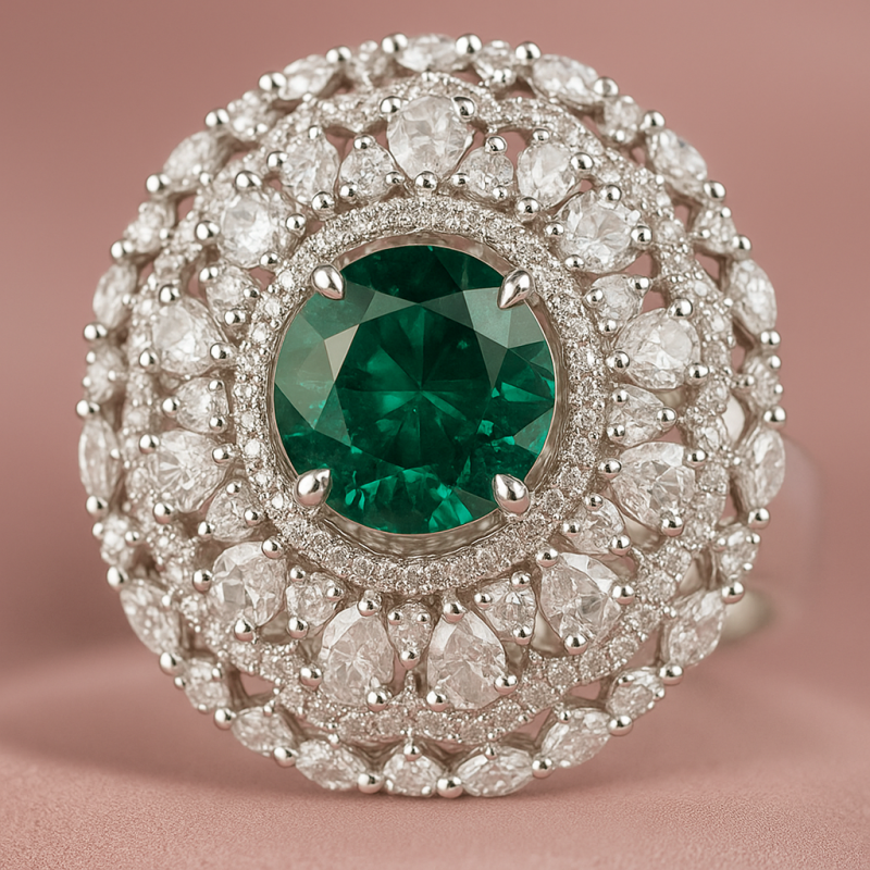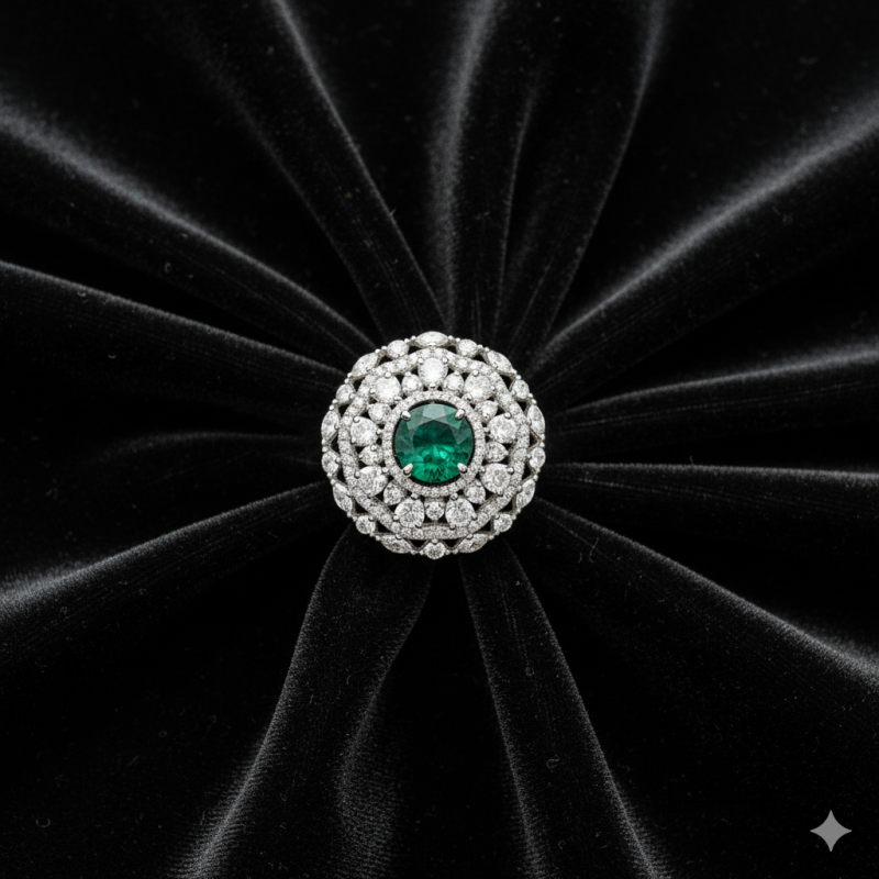 Majestic Solitaire Cocktail Ring is a stunning statement piece that embodies elegance, glamour, and timeless charm. Featuring a bold solitaire centerpiece surrounded by a radiant halo of American Diamonds (CZ), this ring has been meticulously crafted to shine brilliantly under every light. Its intricate floral-inspired design reflects royalty, making it the perfect accessory for women who love jewellery that stands out. Designed with a high-quality alloy base and finished in premium silver plating, this cocktail ring is both durable and luxurious. The adjustable closure ensures a comfortable fit, making it ideal for all ring sizes. Whether you are dressing up for weddings, parties, festive occasions, or adding a touch of sparkle to evening wear, this solitaire AD ring elevates every look with its grandeur. This party wear cocktail ring is part of our exclusive AD jewellery collection, making it a must-have addition to your jewellery box. Pair it with ethnic outfits for a regal bridal look or with modern ensembles for a chic contemporary vibe — its versatile charm makes it a perfect choice for women of all styles.