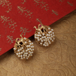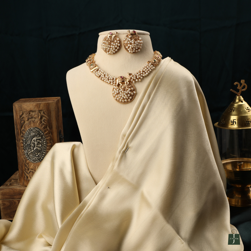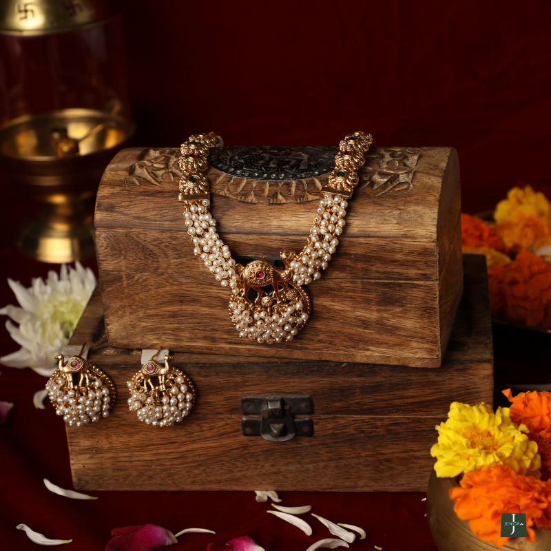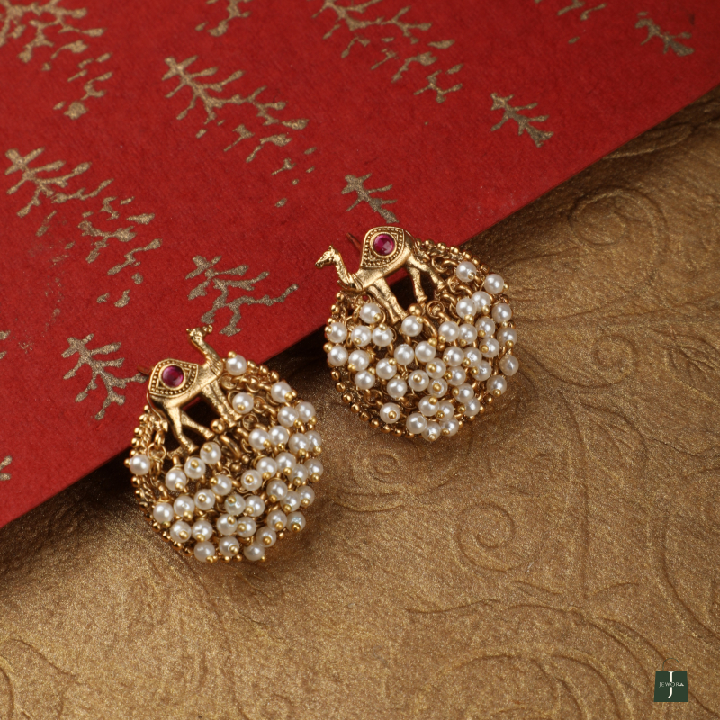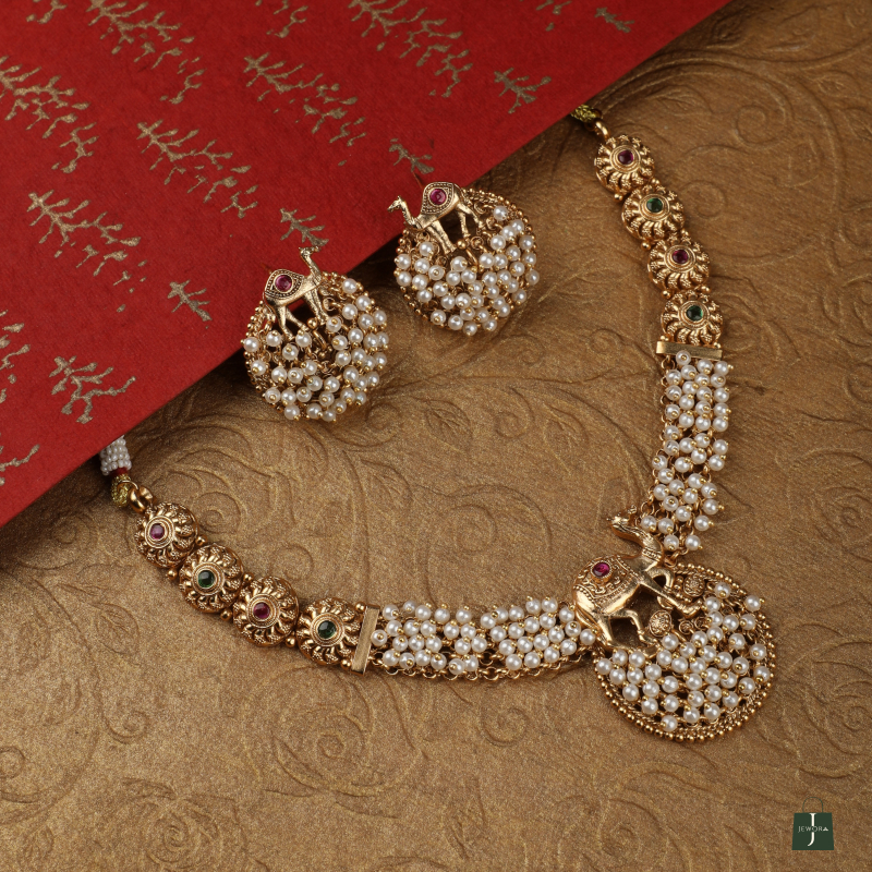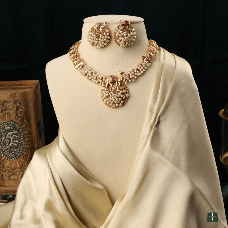 At the center, a striking pendant showcases an intricately sculpted camel motif in a gold-tone finish—symbolising endurance, grace, and cultural heritage. Subtle ruby-toned accents enhance the pendant’s regal appeal, while the surrounding pearl work adds a soft, refined elegance. The matching earrings echo the same design language with pearl clusters and gold detailing, completing the set with perfect harmony.