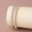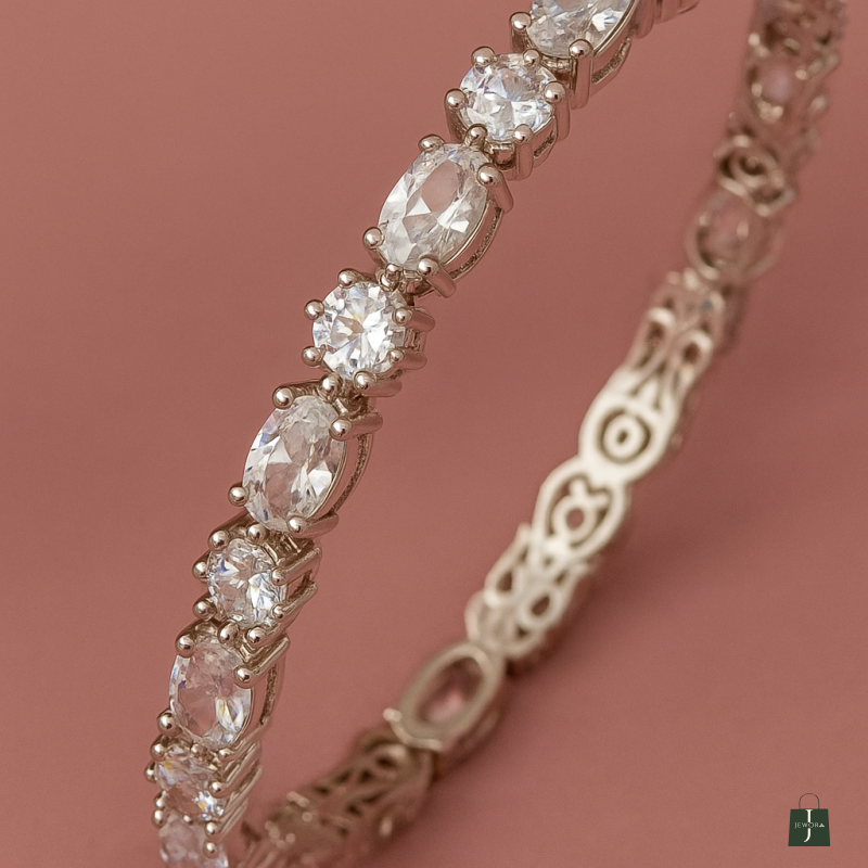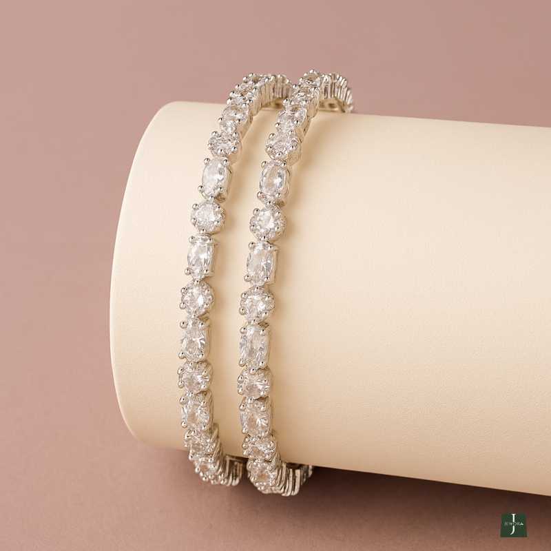 The Marquise Cut AD Bangles are a refined blend of elegance and sparkle, designed for women who appreciate sophisticated jewelry. Crafted with a radiant silver polish, these bangles feature alternating marquise-cut and round American Diamond (CZ) stones, arranged in a seamless pattern that enhances their brilliance. The marquise-shaped stones add a touch of uniqueness and elongation, while the round stones create balance and shimmer, making the design both graceful and eye-catching. Lightweight and comfortable, these bangles are made with durable alloy to ensure long-lasting shine and wearability. Perfect for festive occasions, cocktail parties, or evening gatherings, they can be paired effortlessly with traditional attire such as sarees and lehengas, or styled with modern gowns and dresses for a chic fusion look. This 2-piece set can be worn together for a complete statement or stacked with other bangles and bracelets for a more layered appeal. The Marquise Cut AD Bangles are a must-have for those looking to elevate their jewelry collection with pieces that exude timeless sophistication.