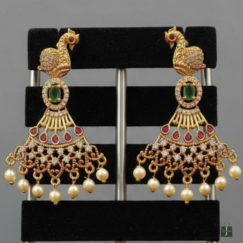 Embrace your inner queen with these exquisitely crafted peacock-motif earrings. Featuring intricate gold-toned filigree, vibrant emerald and ruby-hued stones, and finished with delicate pearl droplets. These stunning earrings also feature a majestic peacock stud leading down to a fan-shaped drop adorned with sparkling AD stones