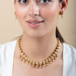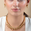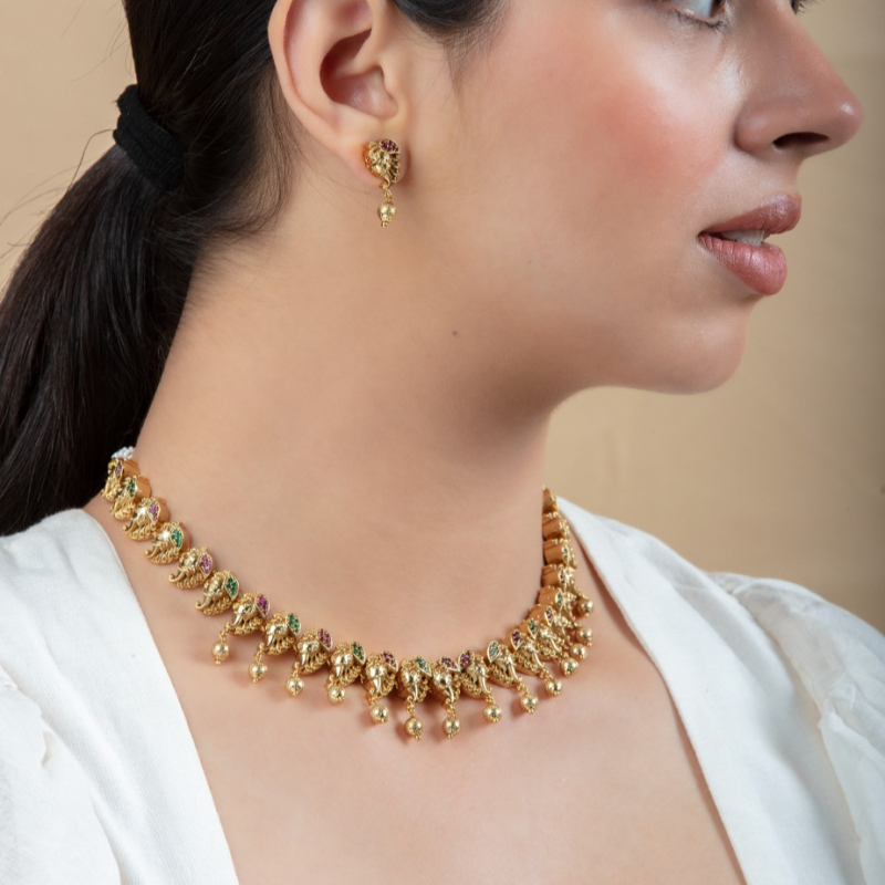 Add a touch of royal elegance to your jewellery collection with this beautifully crafted antique gold choker necklace set. Featuring intricately carved peacock motifs adorned with multicolor stones, this piece reflects traditional artistry with a modern charm. The delicate hanging bead drops enhance its graceful movement, while the matching earrings complete the look. Perfect for festive wear and weddings, this choker set pairs effortlessly with ethnic outfits for a rich and elegant appearance.