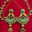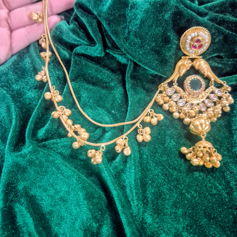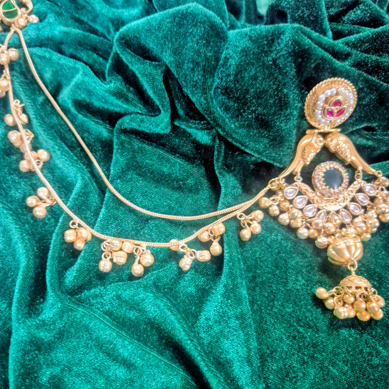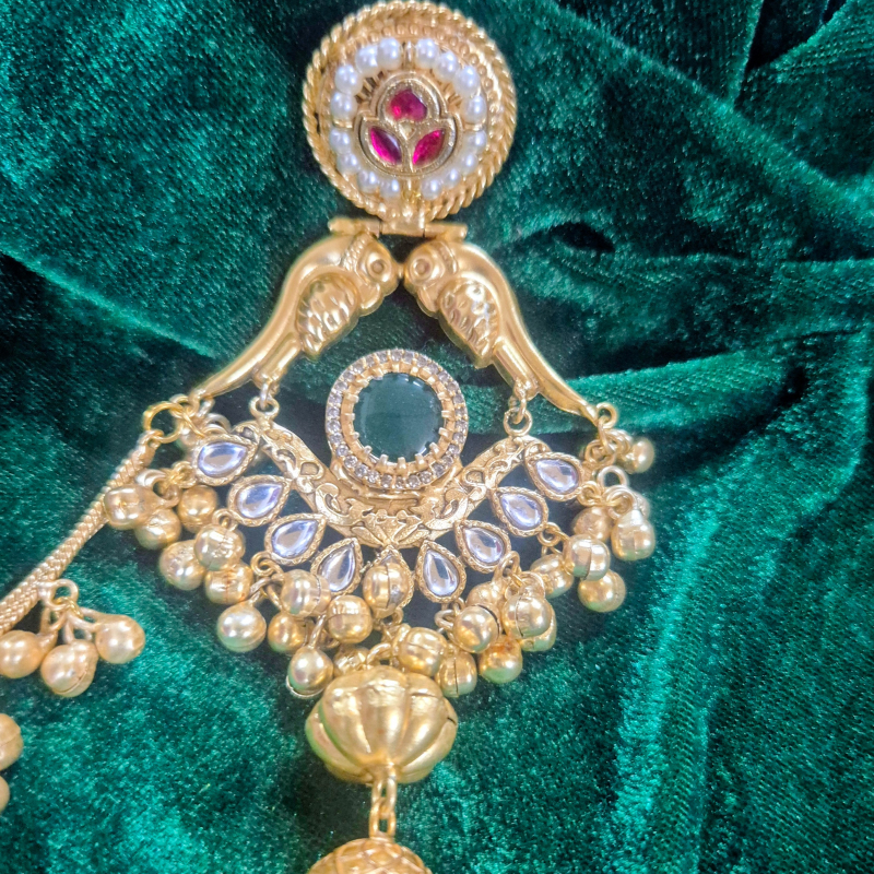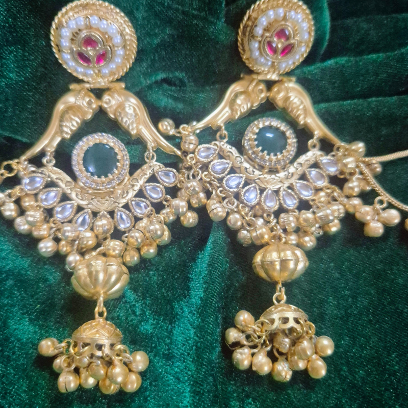 Embrace timeless elegance with these antique gold chandbali earrings, beautifully crafted with a peacock-inspired design. The stud features a delicate kundan and pearl detailing, flowing into graceful bird motifs that enhance the royal appeal. The central section is adorned with fine kundan work and a deep green stone accent, adding richness to the look. Finished with intricately designed jhumka drops and hanging golden beads, these earrings create a perfect blend of tradition and grandeur. Ideal for weddings and festive occasions, this pair adds a regal charm to any ethnic outfit.