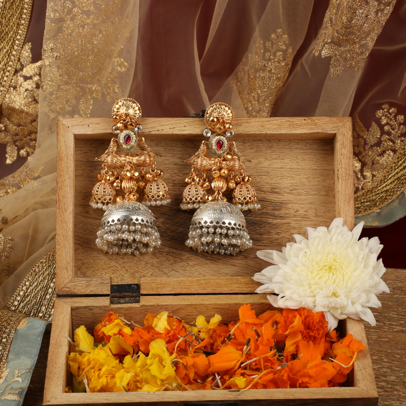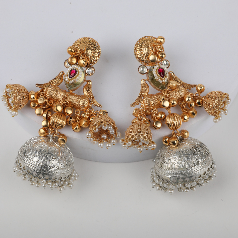 Celebrate timeless craftsmanship with these statement handcrafted jhumka earrings, designed to reflect regal elegance and intricate artistry. Featuring beautifully sculpted bird motifs at the centre, these earrings symbolise grace and harmony, brought to life through detailed gold-tone carving and delicate enamel accents.