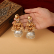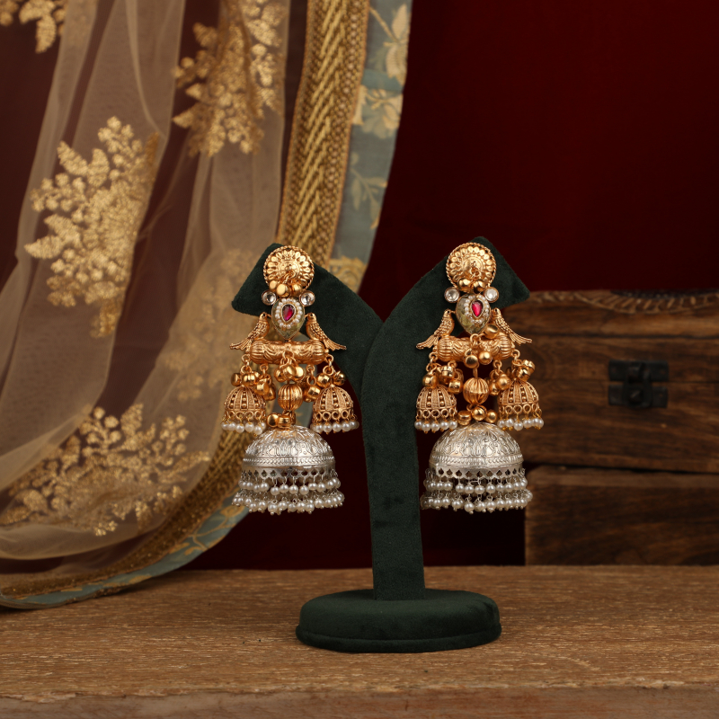The design is further elevated with clusters of tiny gold beads and miniature pearl-detailed jhumkis that add depth, texture, and gentle movement. A contrasting antique silver-finish dome at the base creates a striking balance, finished with fine pearl fringes for a classic traditional touch.