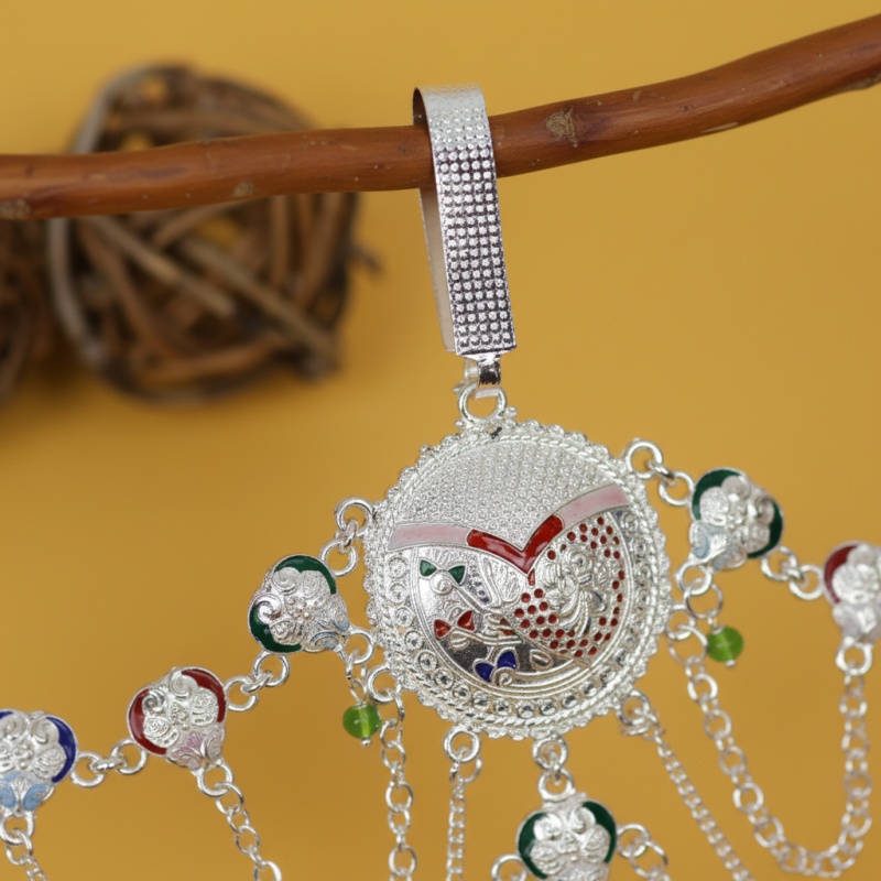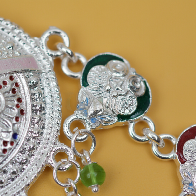 This stunning oxidised kamarbandh features a beautifully crafted peacock motif centerpiece highlighted with intricate detailing and vibrant multicolor enamel accents. The waistline is adorned with a series of small decorative motifs, each enhanced with colorful enamel work that adds a lively touch to the design. Multiple cascading chains drape elegantly across the waist, creating a graceful layered effect. Tiny ghungroo-style danglers add charm and gentle movement, making this kamarbandh a perfect choice for sarees, lehengas, and festive ethnic attire.