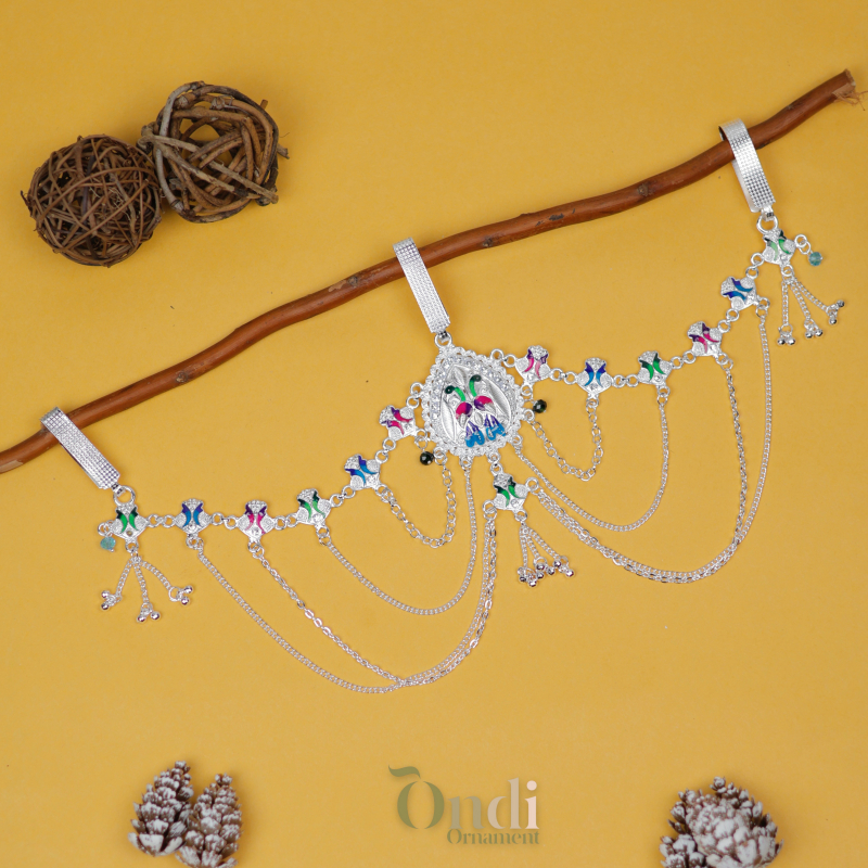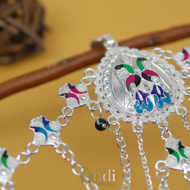 This stunning oxidised kamarbandh showcases a beautifully detailed peacock motif centerpiece, highlighted with vibrant multicolor enamel work. The waist chain is adorned with small decorative motifs featuring colorful enamel accents that add a lively and artistic touch. Elegant layered chains drape gracefully across the waist, while delicate dangling charms enhance its traditional charm. Perfect for pairing with sarees, lehengas, and festive ethnic outfits, this kamarbandh adds a regal and graceful finish to your look.