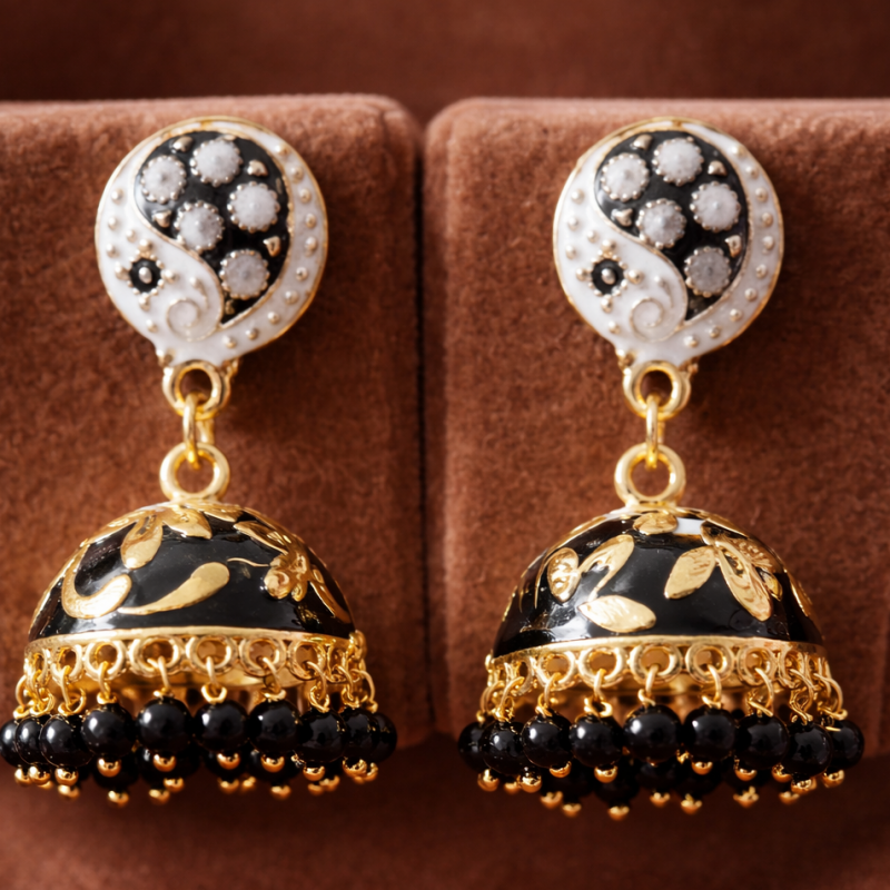 Elegant enamel jhumka earrings with gold-toned metalwork. The circular stud showcases a yin-yang motif with intricate gold detailing, paired with a dome-shaped jhumka featuring embossed designs and a fringe of beads. Perfect for festive or traditional styling.