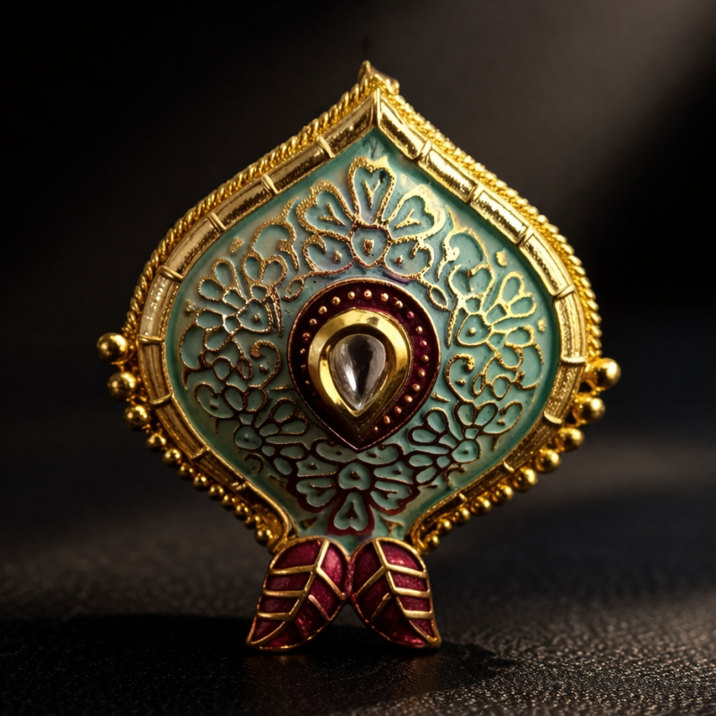 Elegant gold-plated ring with a green enamel base and intricate filigree detailing. Features a central teardrop gemstone set in red enamel accent, complemented by a red enamel leaf motif at the bottom. Perfect for adding traditional flair to outfits.