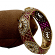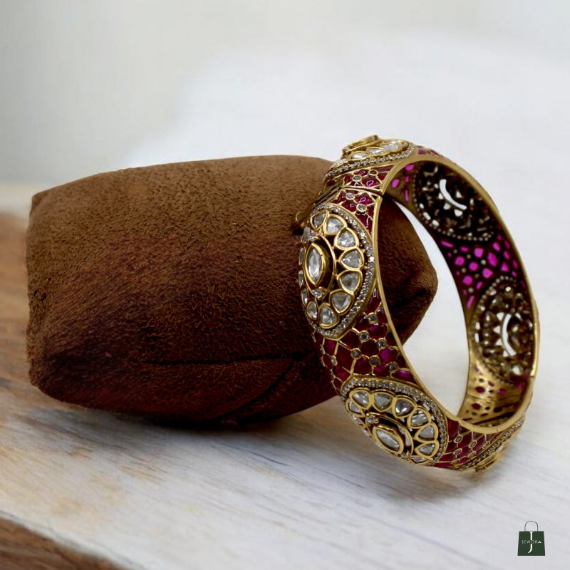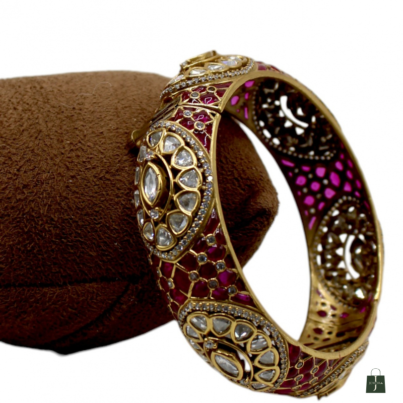 This stunning statement kada showcases an artistic blend of deep crimson enamel work and sparkling white polki-style stones. The broad bangle features intricate circular floral motifs highlighted with pear-shaped and oval stones, creating a rich and detailed appearance. The inner side is beautifully finished with enamel accents and cutwork patterns, adding to its premium craftsmanship.