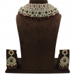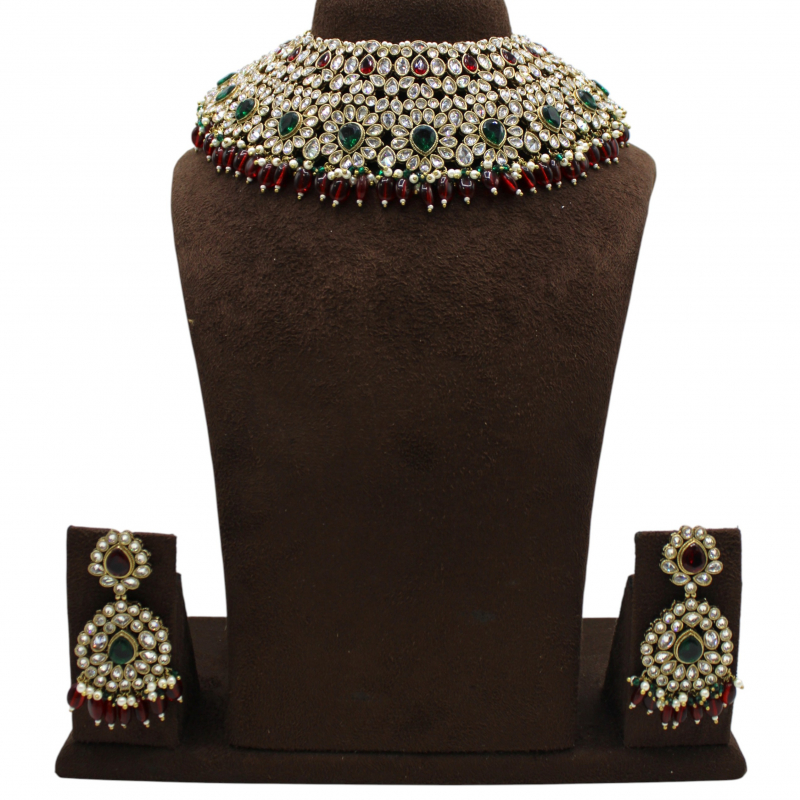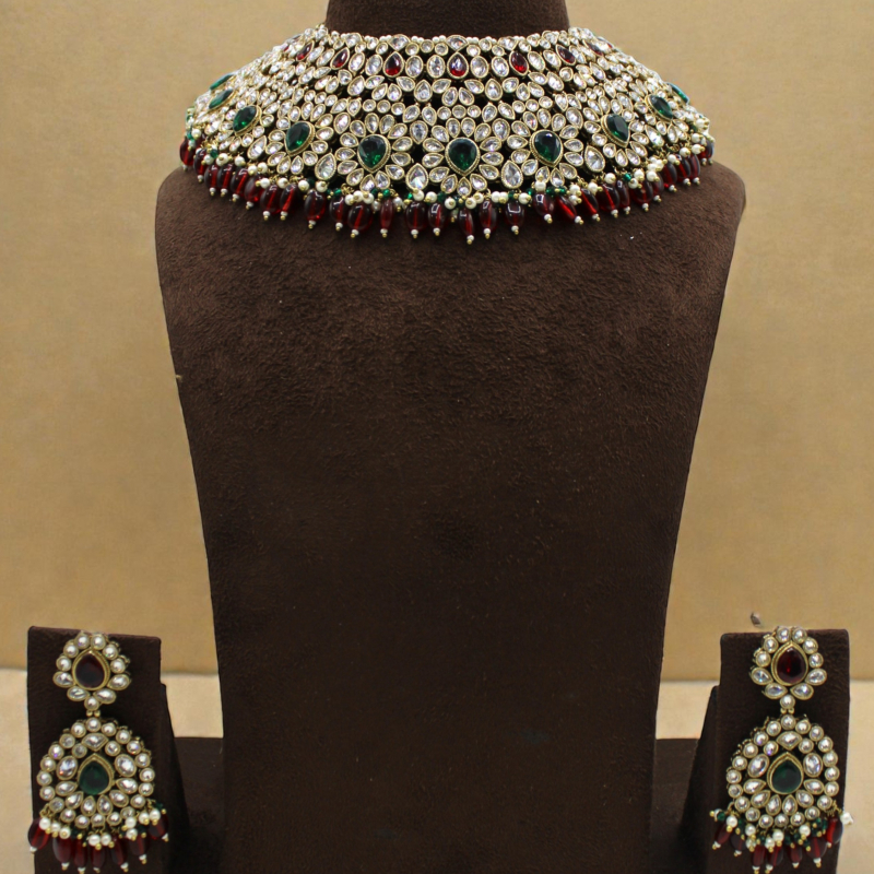 Introducing the Meher Emerald Ruby Kundan Choker Set, a masterpiece crafted for brides who adore rich traditional elegance. This heavily embellished choker features multiple layers of shimmering white kundan stones arranged in a dense royal pattern, creating a grand and luxurious look.