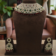 The design is enhanced with deep emerald green oval stones placed gracefully across the necklace, while ruby red bead drops along the border add bold contrast and movement. The matching statement jhumka earrings mirror the same green and red detailing, completing the regal ensemble.