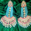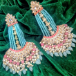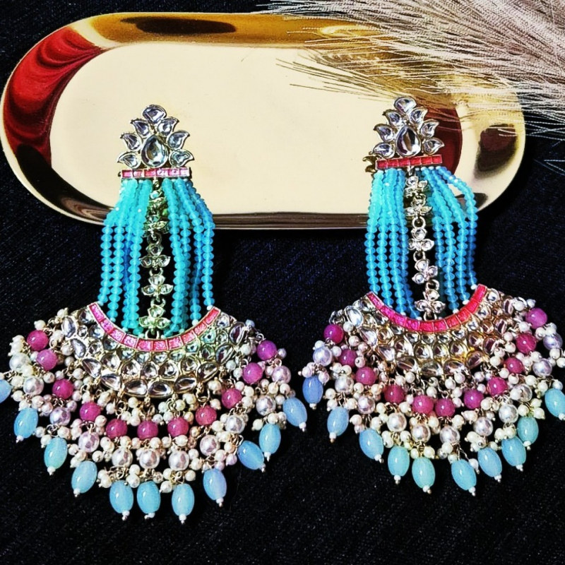 Add a vibrant touch to your festive look with these stunning kundan chandbali earrings. Designed with a floral kundan stud top, the earrings feature multiple strands of aqua blue beads that gracefully flow into a beautifully detailed crescent base. Accented with pink beads, pearls, and mint drops, the design creates a perfect fusion of colors and elegance. The intricate kundan work combined with layered bead detailing makes these earrings a standout accessory for weddings, festive occasions, and special celebrations.