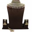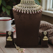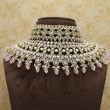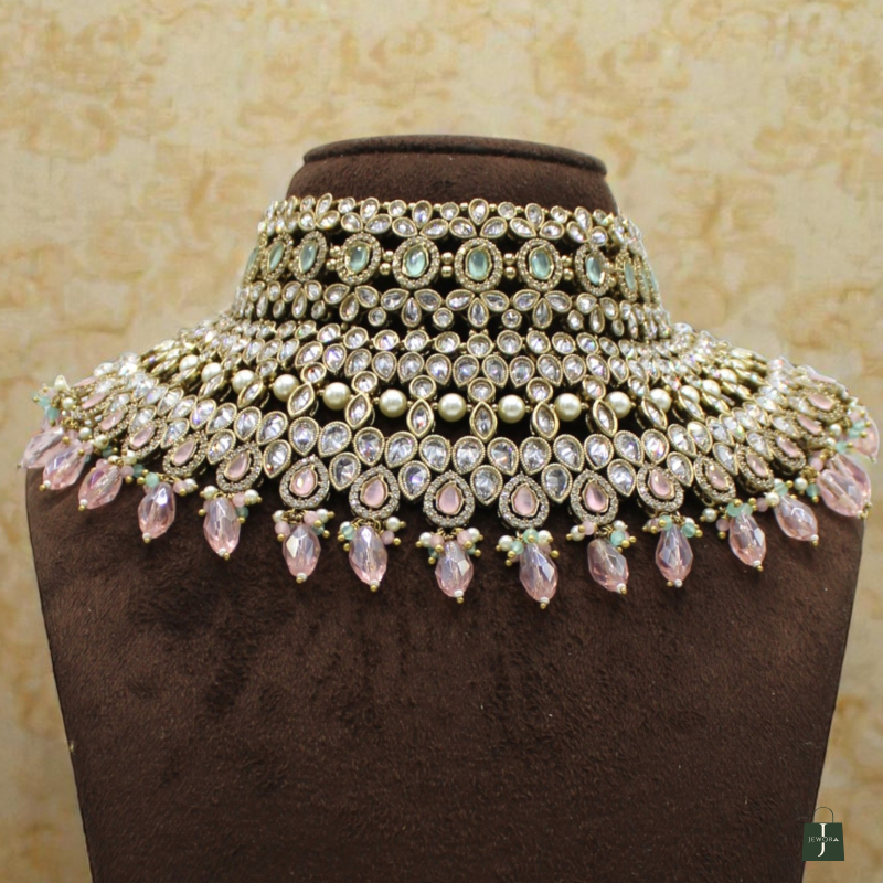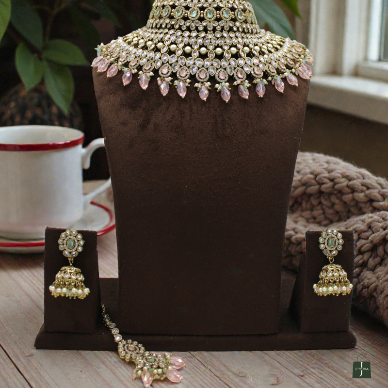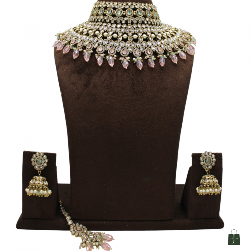 Make a bold and graceful statement with this luxurious layered choker necklace set. Designed with multiple rows of finely placed kundan stones, pearls, and soft pink drop accents, this set brings together elegance and richness in one masterpiece. The intricate detailing, symmetrical layout, and hanging bead finish create a royal yet modern bridal look. Paired with matching jhumka earrings and a coordinating maang tikka, this set is perfect for weddings, receptions, and festive occasions.