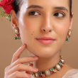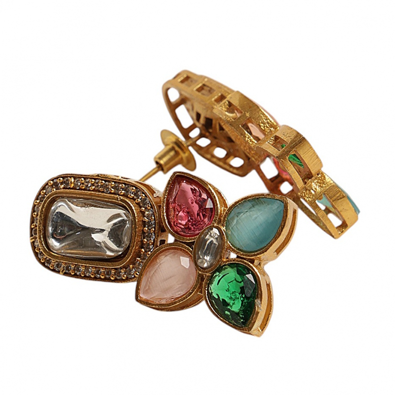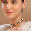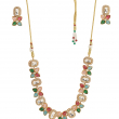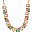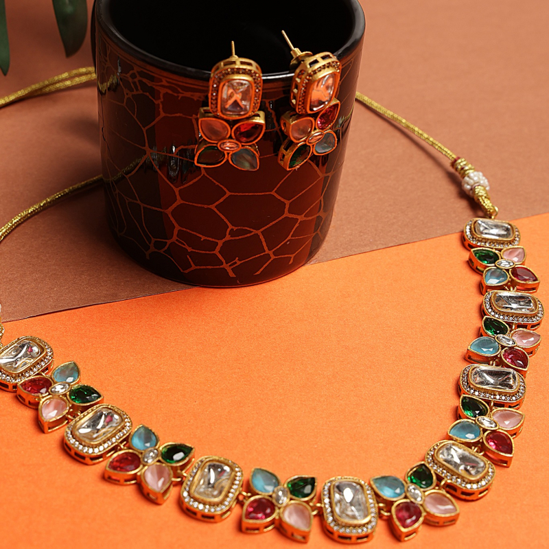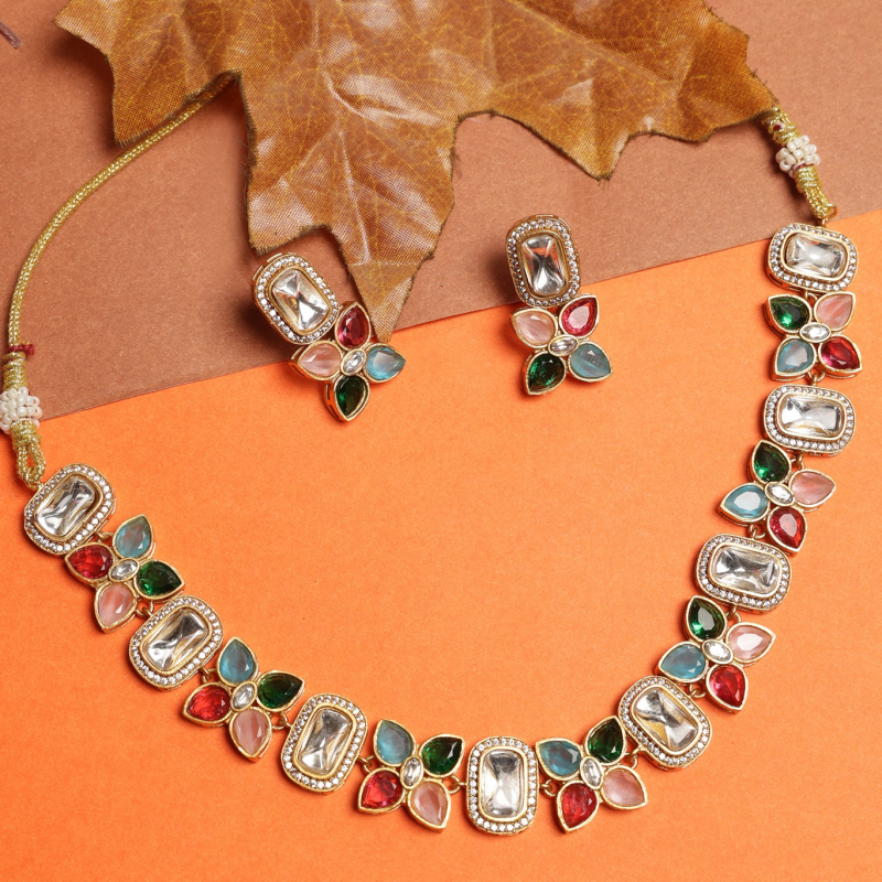 Enhance your ethnic elegance with this beautifully designed multicolor Kundan necklace set. Featuring rectangular Kundan stones paired with vibrant floral motifs, this set showcases a perfect blend of traditional artistry and modern sophistication. The intricate detailing and colorful stone arrangement add a graceful charm, making it an ideal choice for weddings, festive occasions, and special celebrations. Comes with matching stud earrings to complete the look.