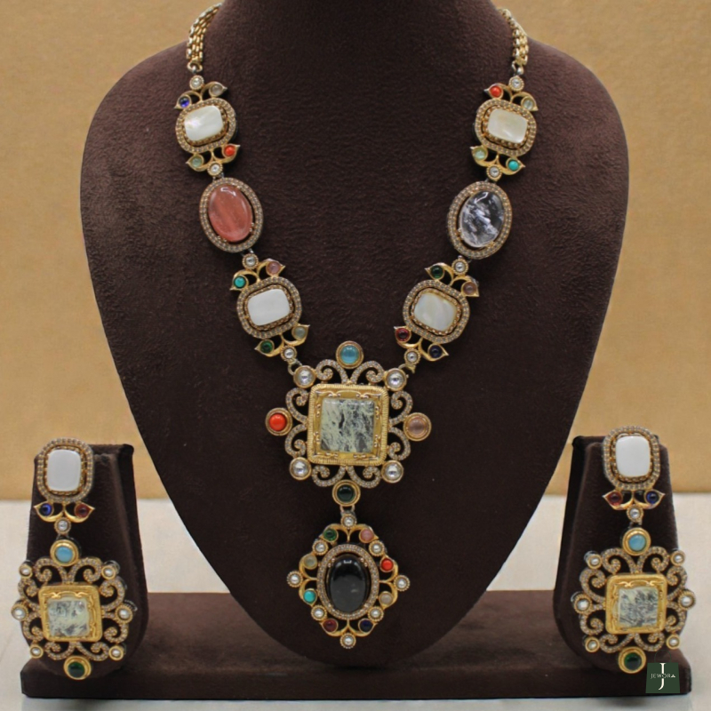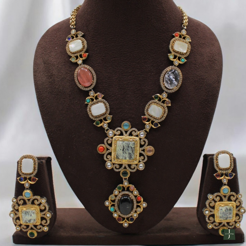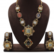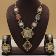 Add a royal charm to your traditional collection with this exquisite multistone heritage necklace set. Designed with a blend of square and oval stones, this piece features elegant uncut-style detailing combined with vibrant coloured accents. The intricate gold-tone framework enhances the beauty of the stones, creating a luxurious and timeless look.
