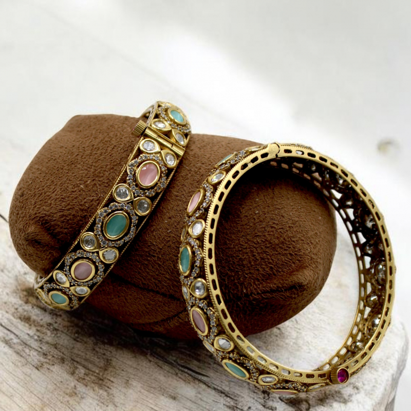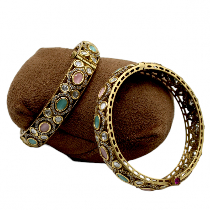 Add a touch of royal elegance to your jewelry collection with these beautifully crafted pastel Kundan kada bangles. Designed with a rich gold-tone base, the bangles feature a stunning arrangement of oval pastel stones in soft pink and mint green hues, accented with sparkling clear Kundan crystals.