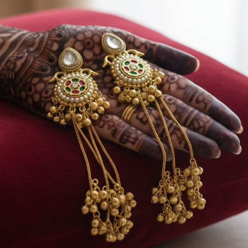 Flowing from the base are multiple slender gold chains that cascade into clustered ghungroo-style beads, creating graceful movement and a luxurious traditional look. These earrings are perfect for bridal wear, weddings, and grand festive occasions, complementing lehengas, sarees, and traditional ensembles effortlessly.
