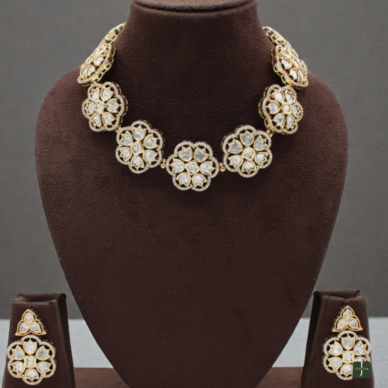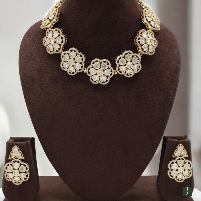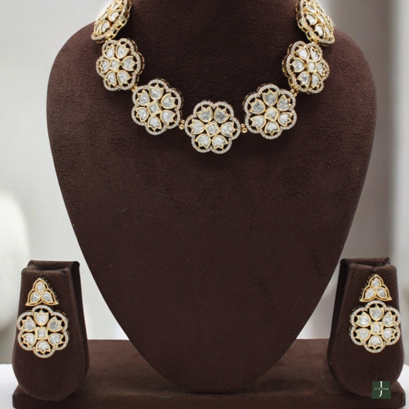 Radiate timeless elegance with this stunning floral Polki necklace set. Designed with intricately crafted flower-shaped motifs, each bloom features delicately arranged heart-shaped Polki stones that create a soft, radiant sparkle. The antique gold finish enhances its royal charm, making it a perfect blend of tradition and sophistication.