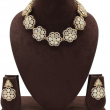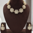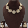 The structured floral panels sit gracefully around the neckline, creating a balanced statement look. Paired with matching drop earrings that echo the same floral design, this set is ideal for weddings, engagements, festive celebrations, and traditional gatherings.