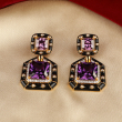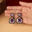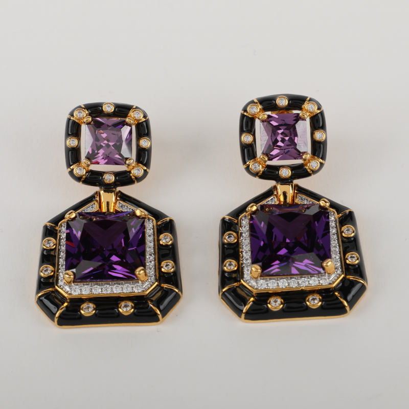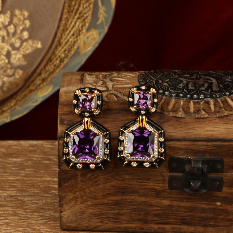 leek, bold, and unmistakably modern, these statement earrings are designed to make an impact. Featuring a striking double-square silhouette, the design showcases deep purple, faceted stones set within a glossy black enamel frame. Delicate crystal accents outline the edges, while gold-toned detailing adds a refined contrast and a touch of luxury.