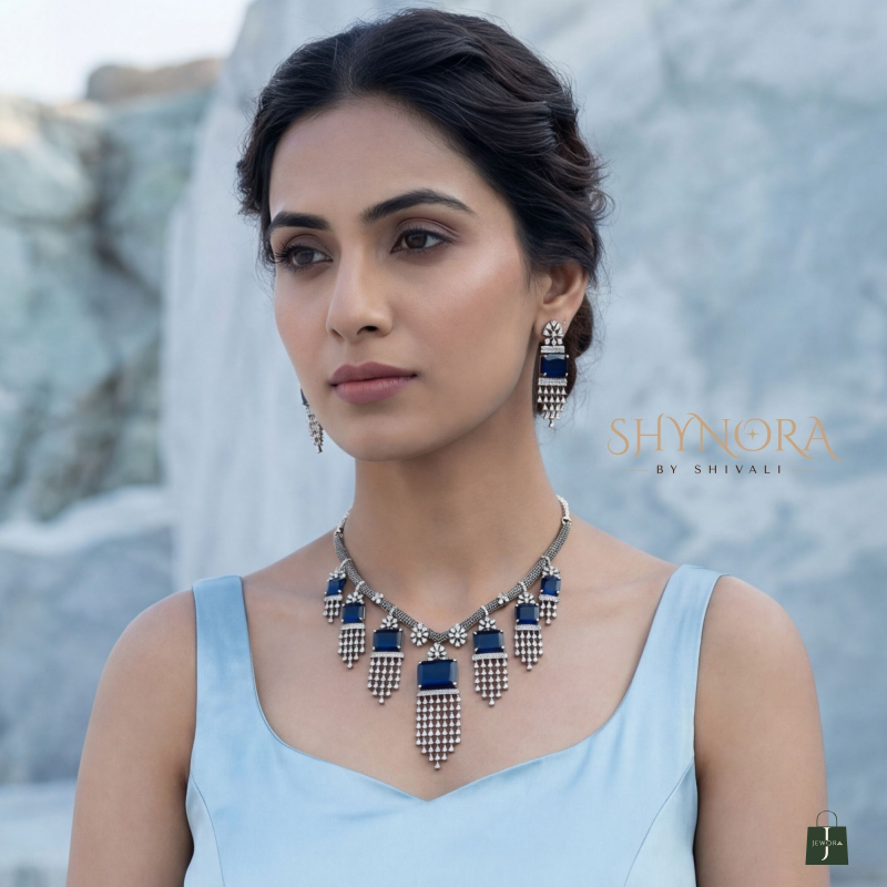 The Midnight Blue Cascade Drop Necklace Set is a bold statement piece crafted for glamorous evenings and grand celebrations. Designed with striking deep blue rectangular stones, this necklace features elegant crystal tassel drops that flow beautifully, creating a dramatic yet refined look. The matching earrings mirror the cascading design, completing the set with perfect balance.