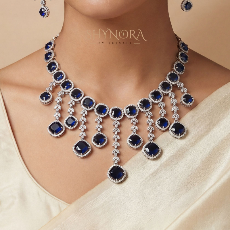 Make a bold style statement with this Midnight Blue Sapphire Chandelier Necklace Set, designed for women who love elegant and luxurious jewelry. This stunning necklace set features deep blue square-cut stones surrounded by sparkling clear crystals, arranged in a graceful cascading chandelier pattern.