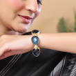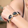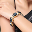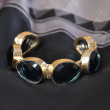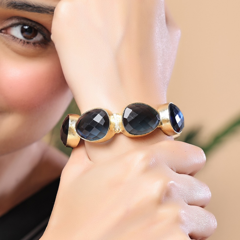 Add a bold and sophisticated touch to your look with this striking cuff bracelet. Designed with a series of deep midnight blue faceted stones set in a textured gold-toned frame, this piece exudes modern elegance. The open cuff structure ensures easy wear and a comfortable fit, making it a perfect accessory for both casual and evening styling.