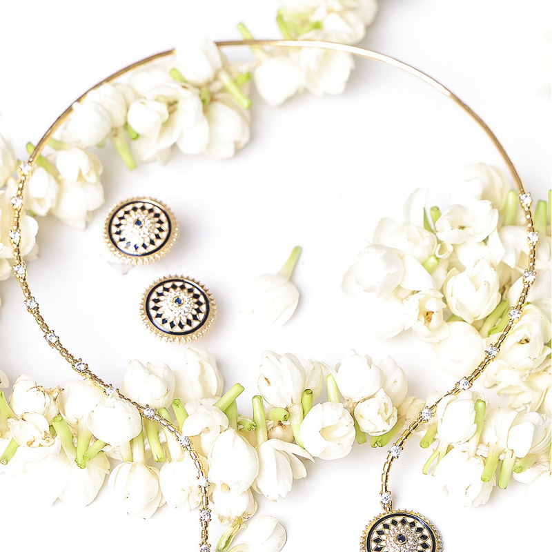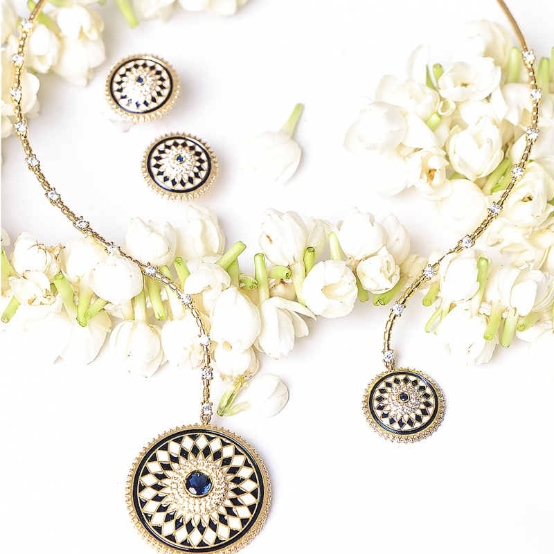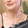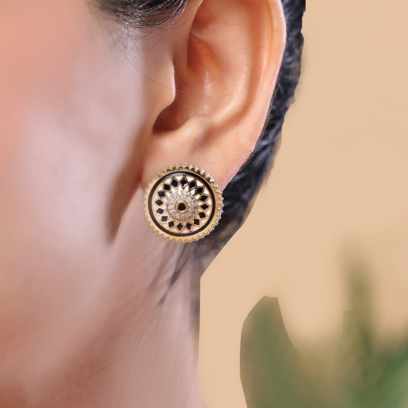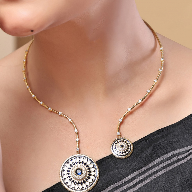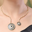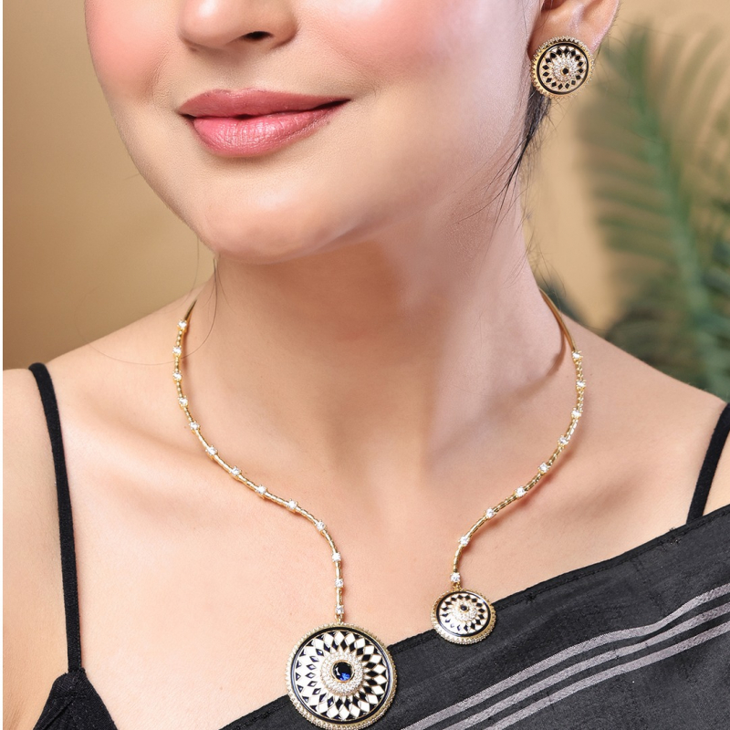 Make a bold yet elegant statement with this Midnight Enamel Medallion Necklace Set. Featuring a unique dual-pendant design, this set showcases intricately crafted circular medallions adorned with geometric enamel patterns in classic black and white tones. The delicate gold-toned chain is accented with fine crystal embellishments, adding subtle sparkle and sophistication. Paired with matching stud earrings, this set is perfect for modern women who love a fusion of minimalism and artistic design.