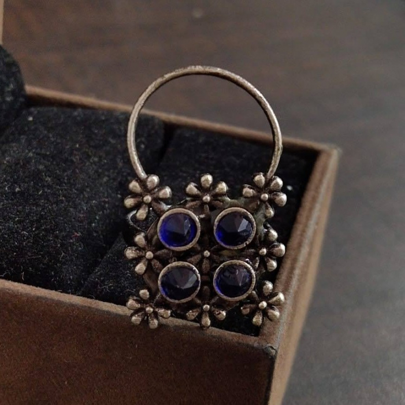 Add a touch of vintage elegance to your jewelry collection with this beautifully crafted floral halo ring. Designed in a delicate circular pattern, the ring features intricate tiny flower motifs surrounding four deep blue stones placed at the center. The oxidised silver finish enhances its antique appeal, giving it a perfect blend of tradition and modern boho style. Lightweight yet eye-catching, this ring is ideal for everyday wear as well as festive styling. Its unique design makes it a subtle statement piece that complements both ethnic and western outfits effortlessly.