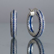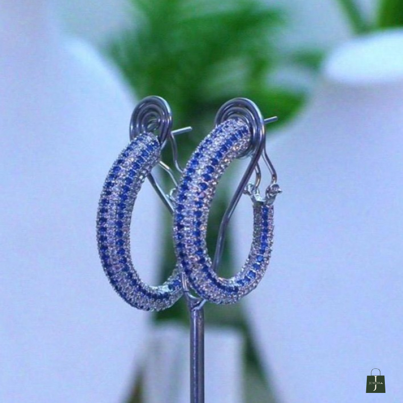 Crafted with meticulous attention to detail, these exquisite hoops feature three stunning rows of brilliant-cut stones. At the heart lies a striking center of deep cobalt blue, flanked by two shimmering borders of icy white pavé. The contrast creates a mesmerizing dance of light, reminiscent of stars scattered across a midnight horizon.