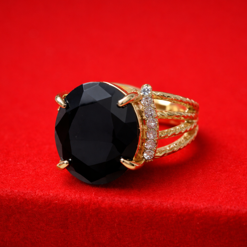 "Stunning collection of black gemstone ring with golden-finish metal and diamond-like accents. Adjustable fit for versatile styling. Perfect for adding a pop of color to any outfit."