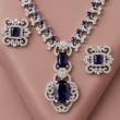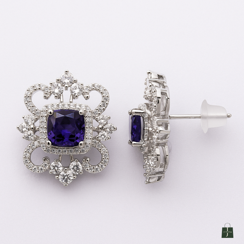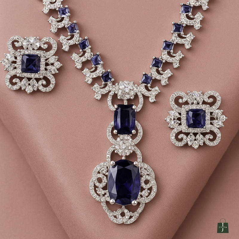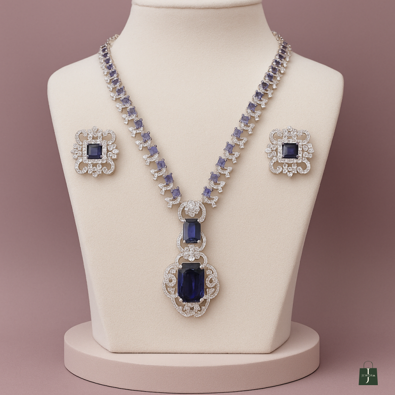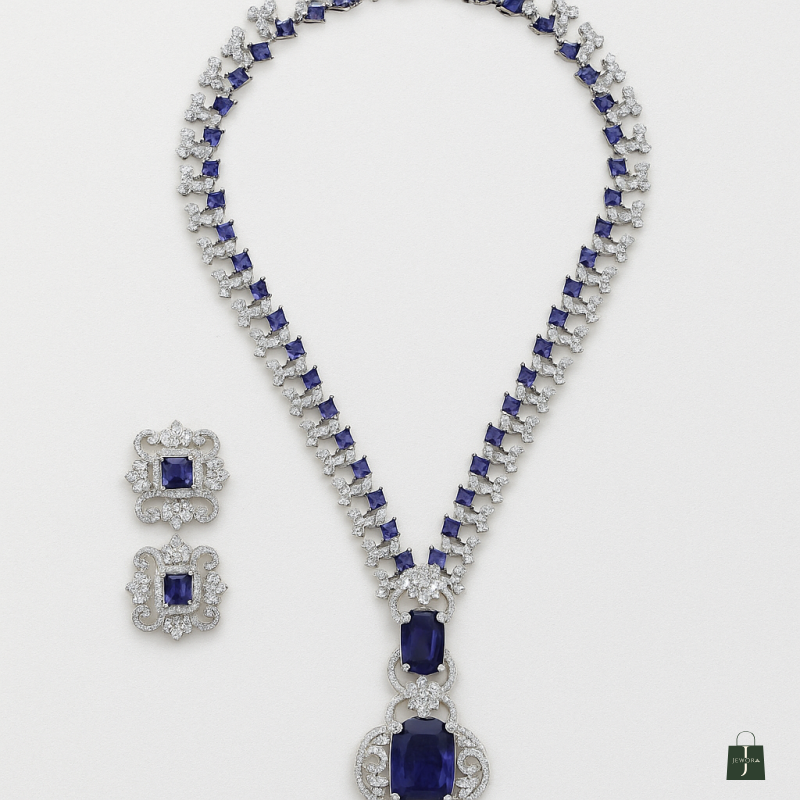 Commanding yet refined, the Midnight Majesty Sapphire Necklace Set is crafted to spotlight deep, jewel-toned brilliance framed by high-shine American Diamonds (CZ). A rhythmic procession of sculpted links—each pavé-set with CZ—leads to a statement centerpiece featuring tiered emerald-cut sapphire-hued stones stacked above an ornate halo pendant with lace-like detailing. The coordinating earrings echo the set’s regal geometry with cushion motifs and a sparkling CZ border, creating a cohesive, elevated silhouette. Designed on a durable alloy base with smooth rhodium finish, the necklace rests comfortably along the collarbone while offering exceptional light play from every angle. Ideal for festive and bridal wardrobes alike, it pairs effortlessly with sarees, lehengas, and contemporary evening gowns. Lightweight construction ensures long wear without compromise, while secure clasps provide a confident fit. If you favor heirloom charm with modern precision, this set delivers a luxurious, photo-ready look that enhances any special-occasion ensemble and transitions elegantly to formal receptions and celebrations.