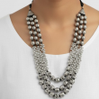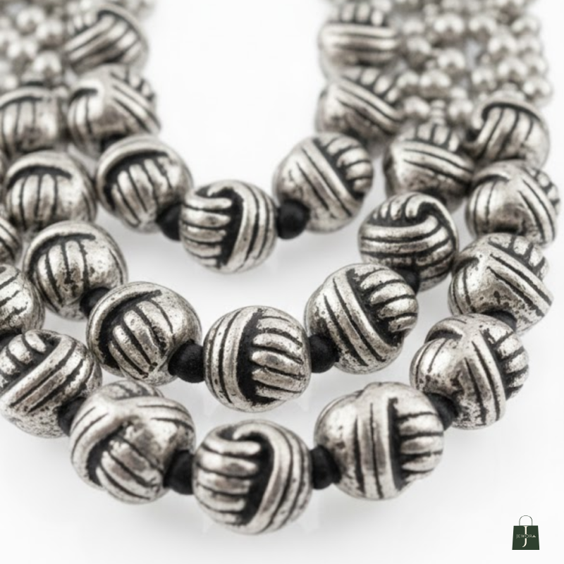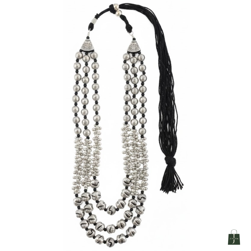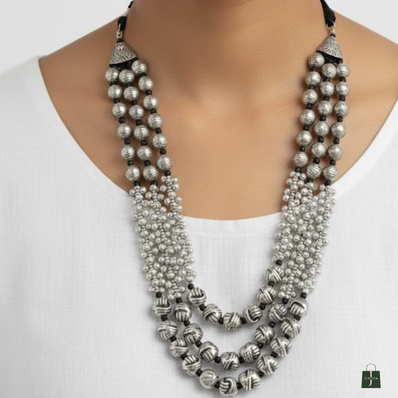 A bold three-layer oxidised silver necklace crafted with textured beads, black accents, and handwoven detailing. Perfect for elevating ethnic outfits with a rich, traditional charm.