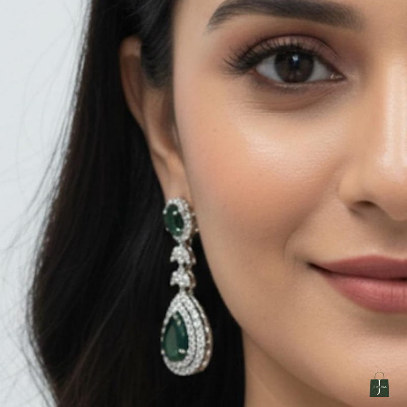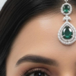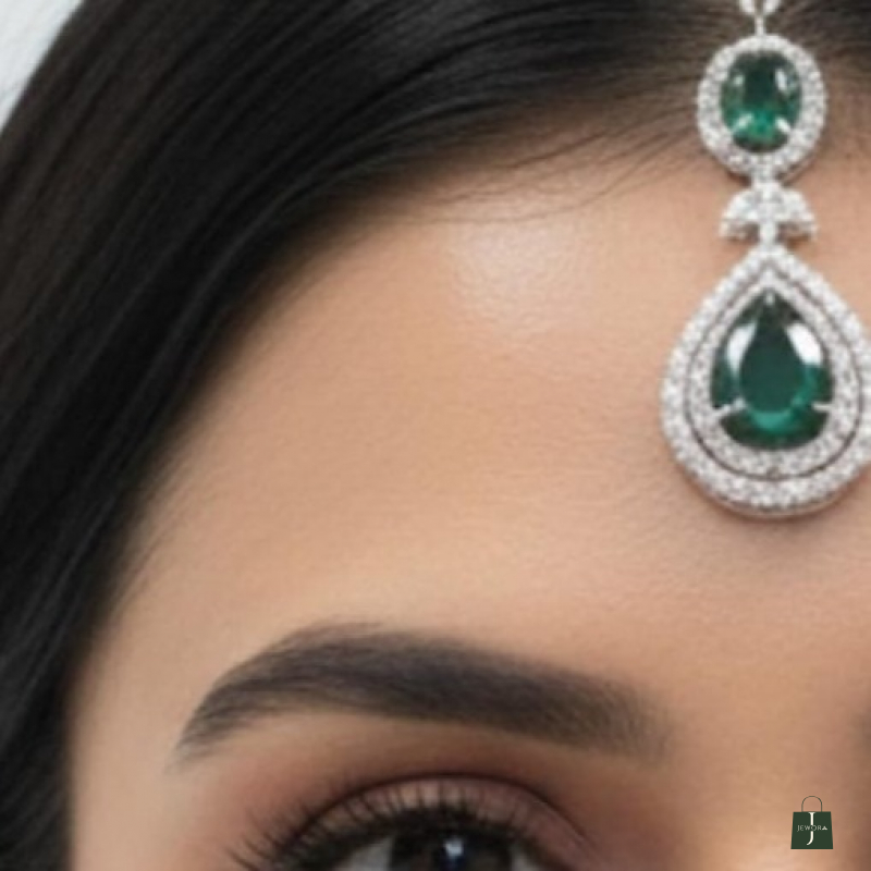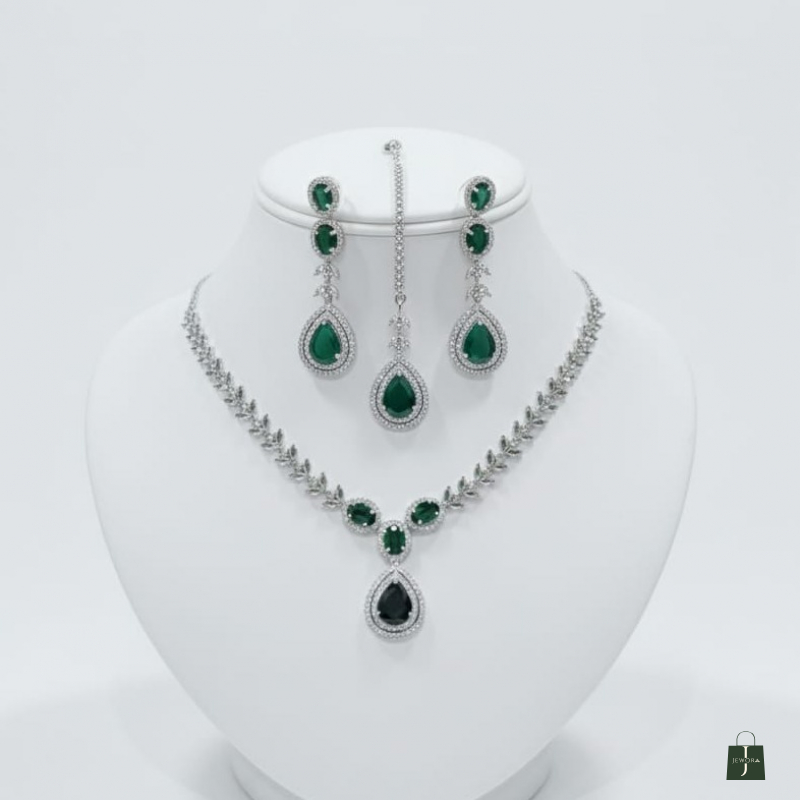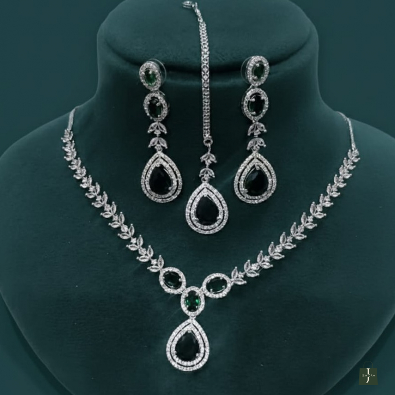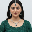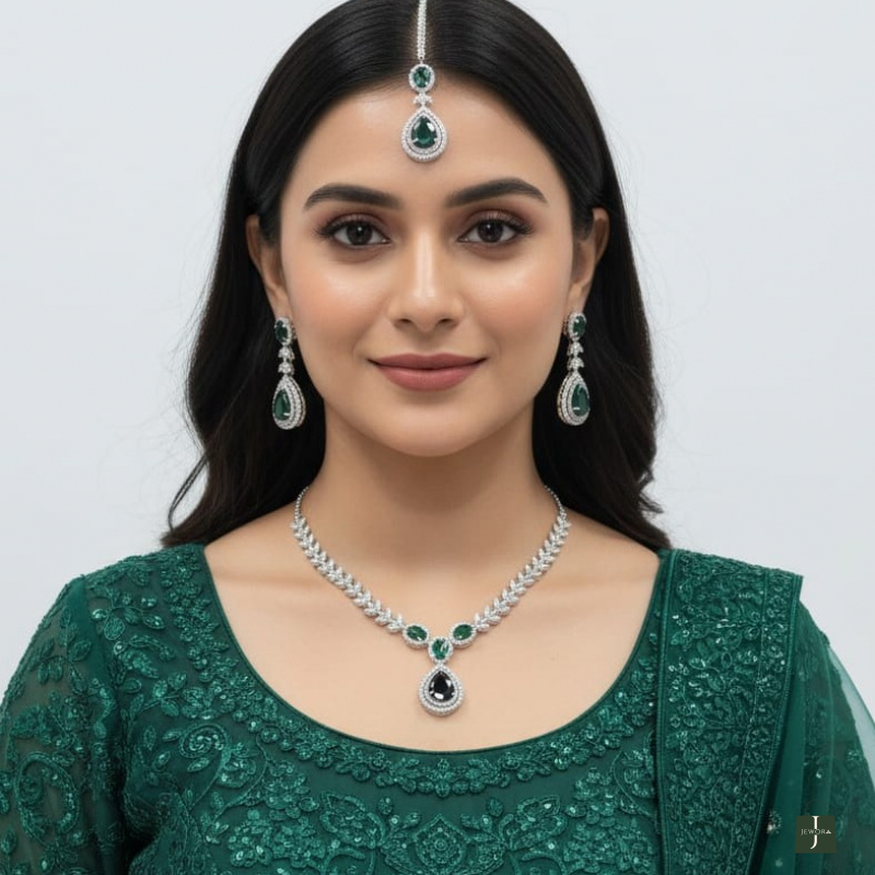 The delicately crafted leaf-inspired necklace chain enhances the overall grace, while the bold central pendant adds a striking focal point. Paired with long drop earrings and a matching maang tikka-style pendant piece, this set is perfect for weddings, receptions, evening galas, and festive celebrations.