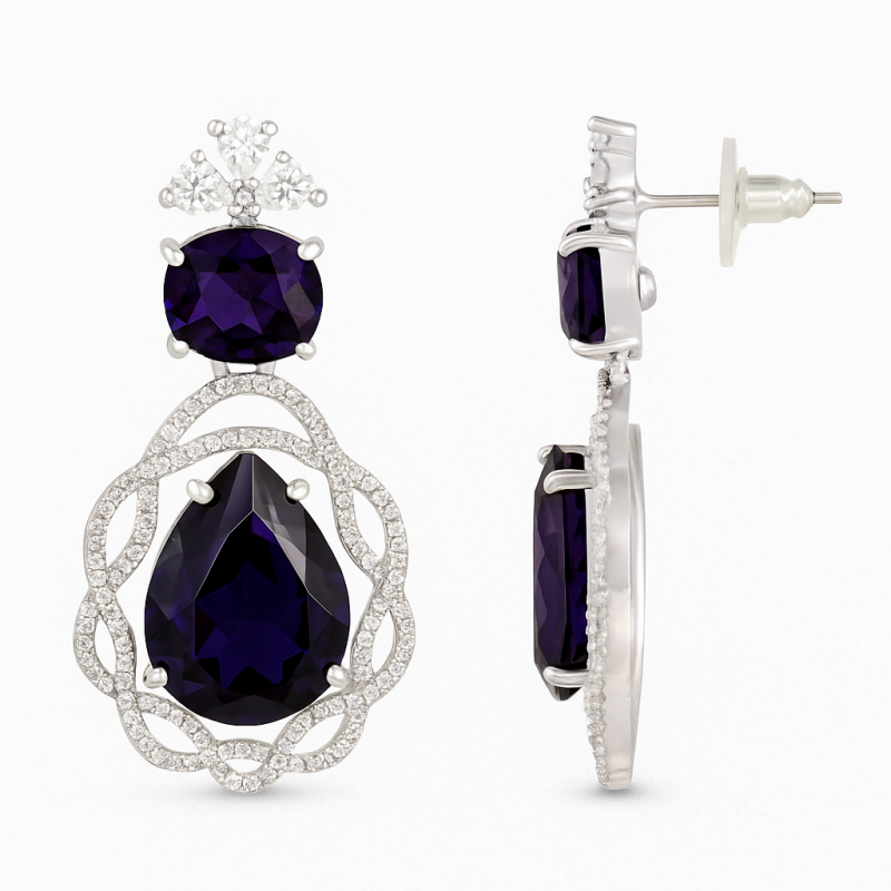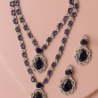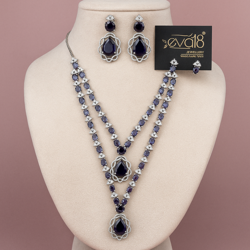 Elevate your evening look with this luxurious *Midnight Velvet Stone Necklace Set*. Featuring deep sapphire blue stones arranged in a dual-layer necklace design, this set exudes elegance and sophistication. Each stone is carefully bordered with sparkling American Diamonds, creating a dazzling contrast that enhances the richness of the blue. The intricate oval motifs around the pendant and earrings highlight the craftsmanship, while the delicate silver-toned base adds a refined touch. Perfect for grand occasions, parties, or festive celebrations, this set comes with matching earrings designed for both comfort and style. Pair it with your favorite evening gown or traditional attire to make an unforgettable impression.