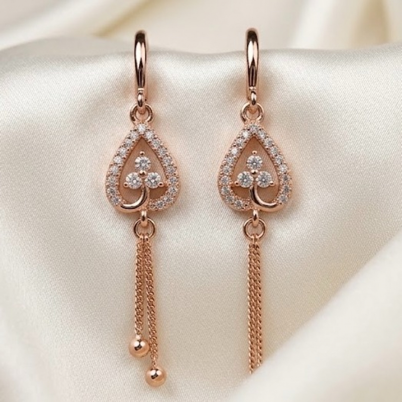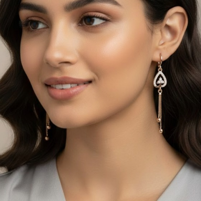Elegant and minimal, these rose gold polish drop earrings are designed to add a touch of sparkle to your everyday and party looks. Adorned with shimmering Cubic Zirconia stones, the delicate heart-inspired design with a sleek chain drop creates a graceful and modern style. Lightweight and comfortable to wear, these earrings are perfect for dinners, parties, or special occasions when you want a subtle yet classy shine.