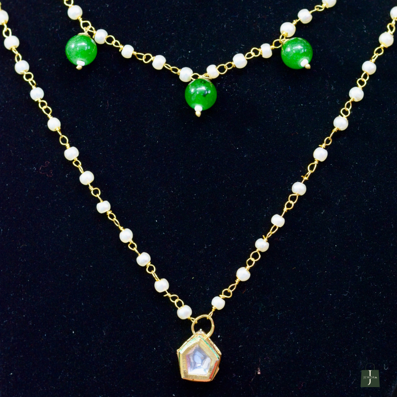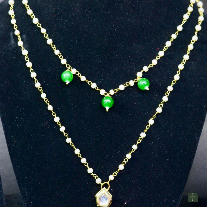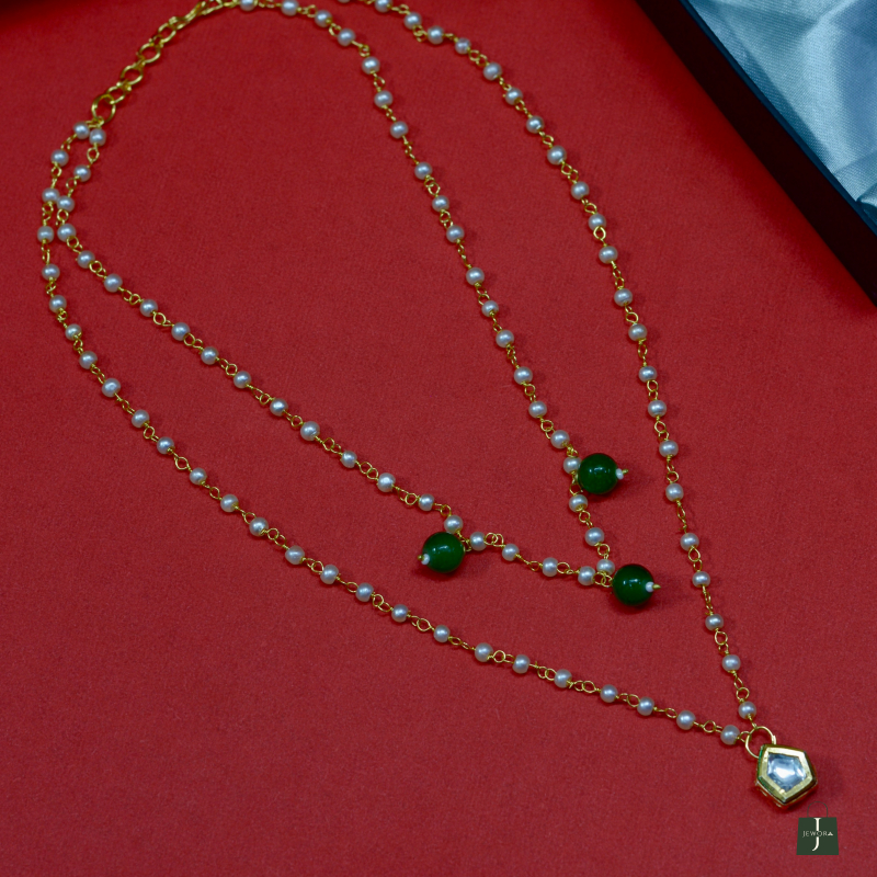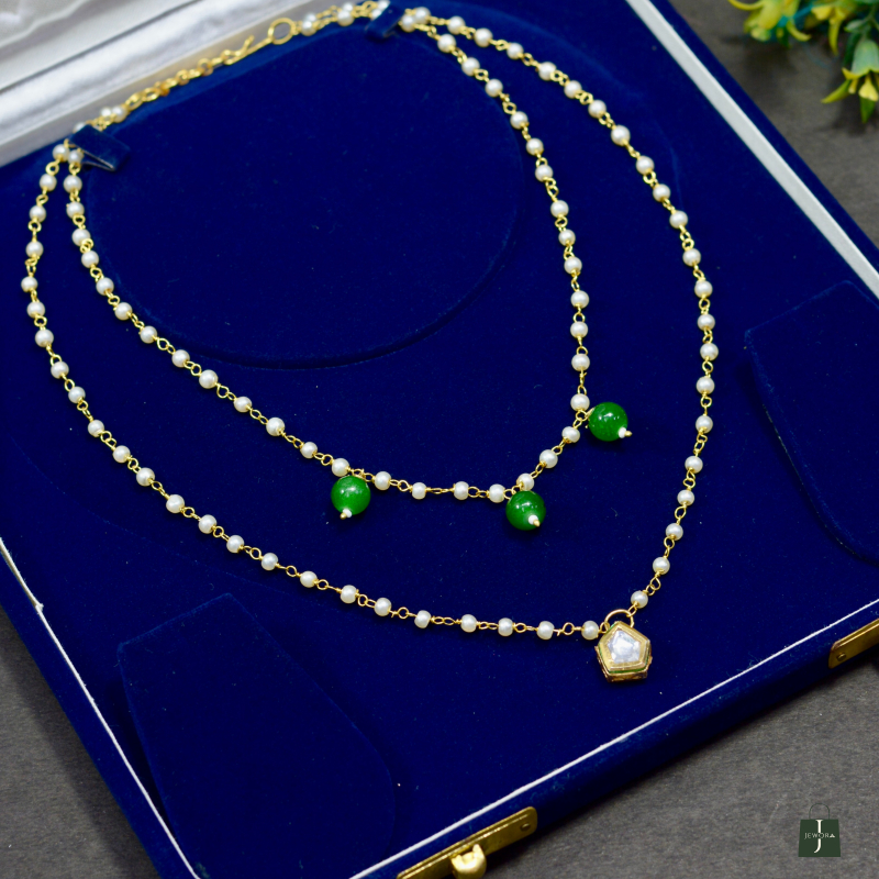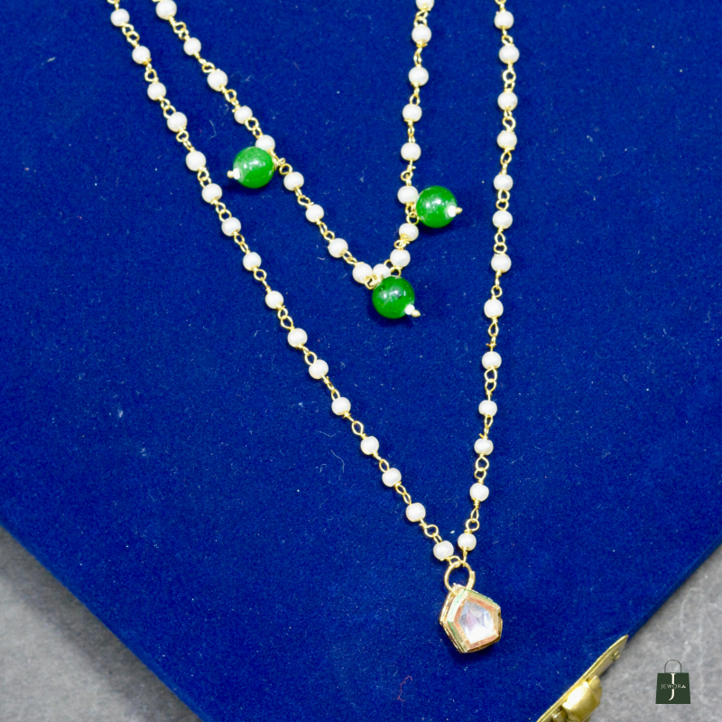 This Minimal Pearl Chain Pendant Kundan Necklace showcases delicate pearl chains paired with a refined Kundan pendant. The clean design and soft shimmer offer understated luxury, making it ideal for daily elegance, festive layering, and graceful ethnic styling with a premium look at an accessible price.